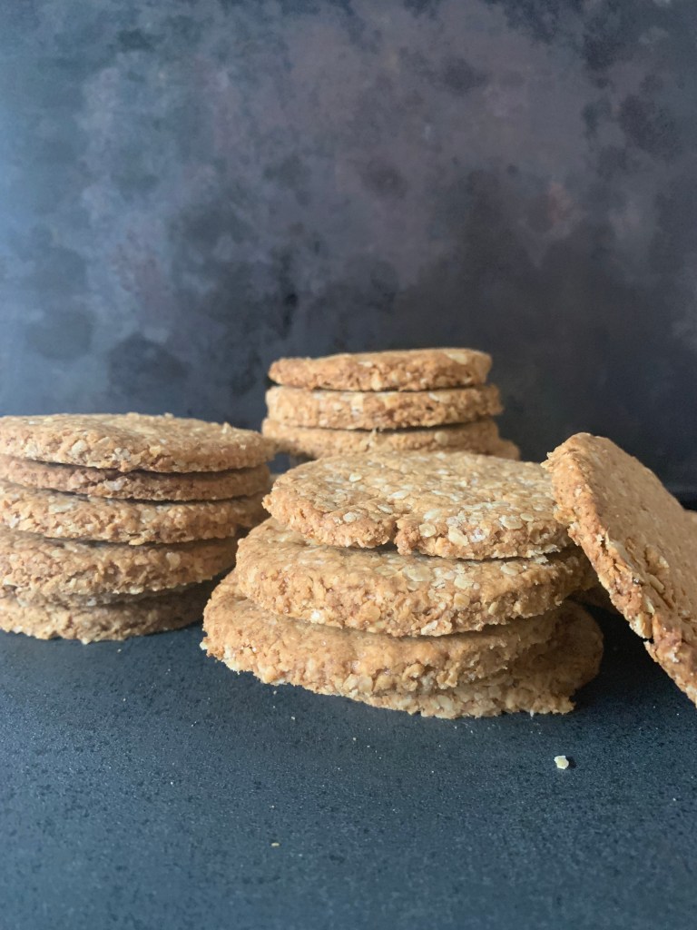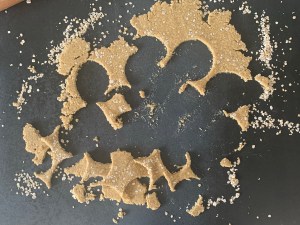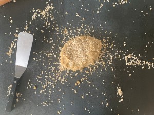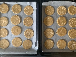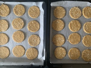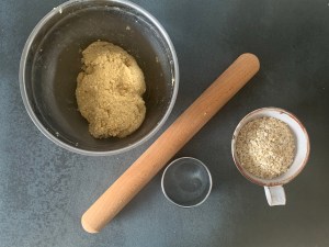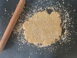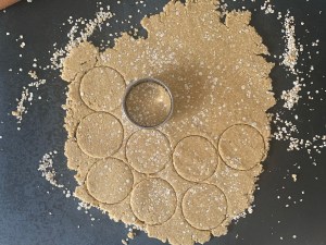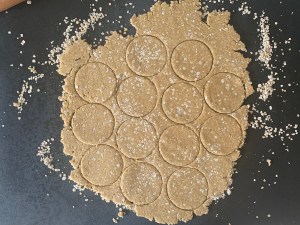 Strör ut havregryn på bänken, lägger degen ovanpå, lite mer havregryn på toppen och sen kavlar jag ut degen. Stansar runda kakor, flyttar till plåt, naggar och bakar av. Restbitarna knådar jag ihop och stansar tills all deg är använd.