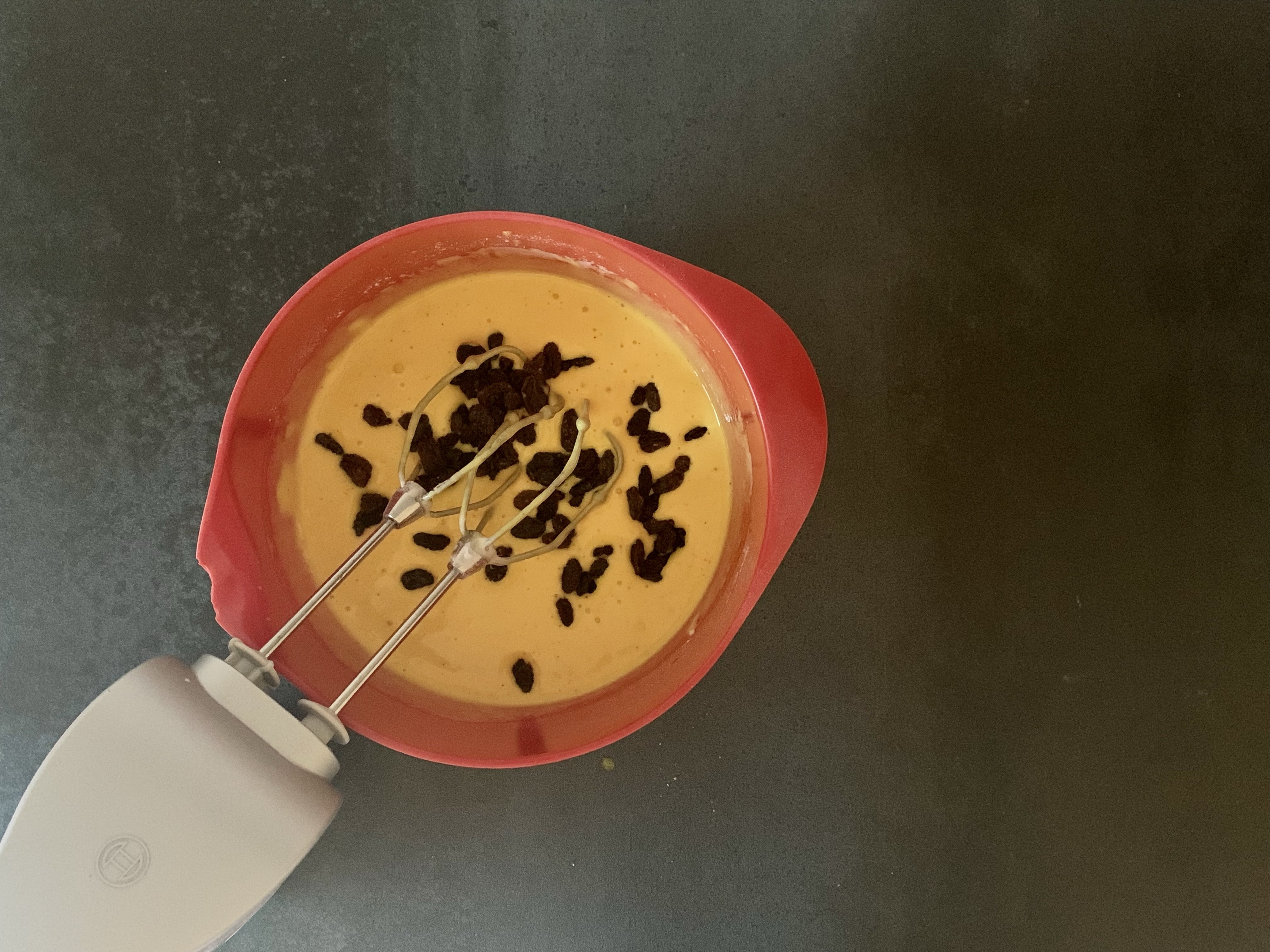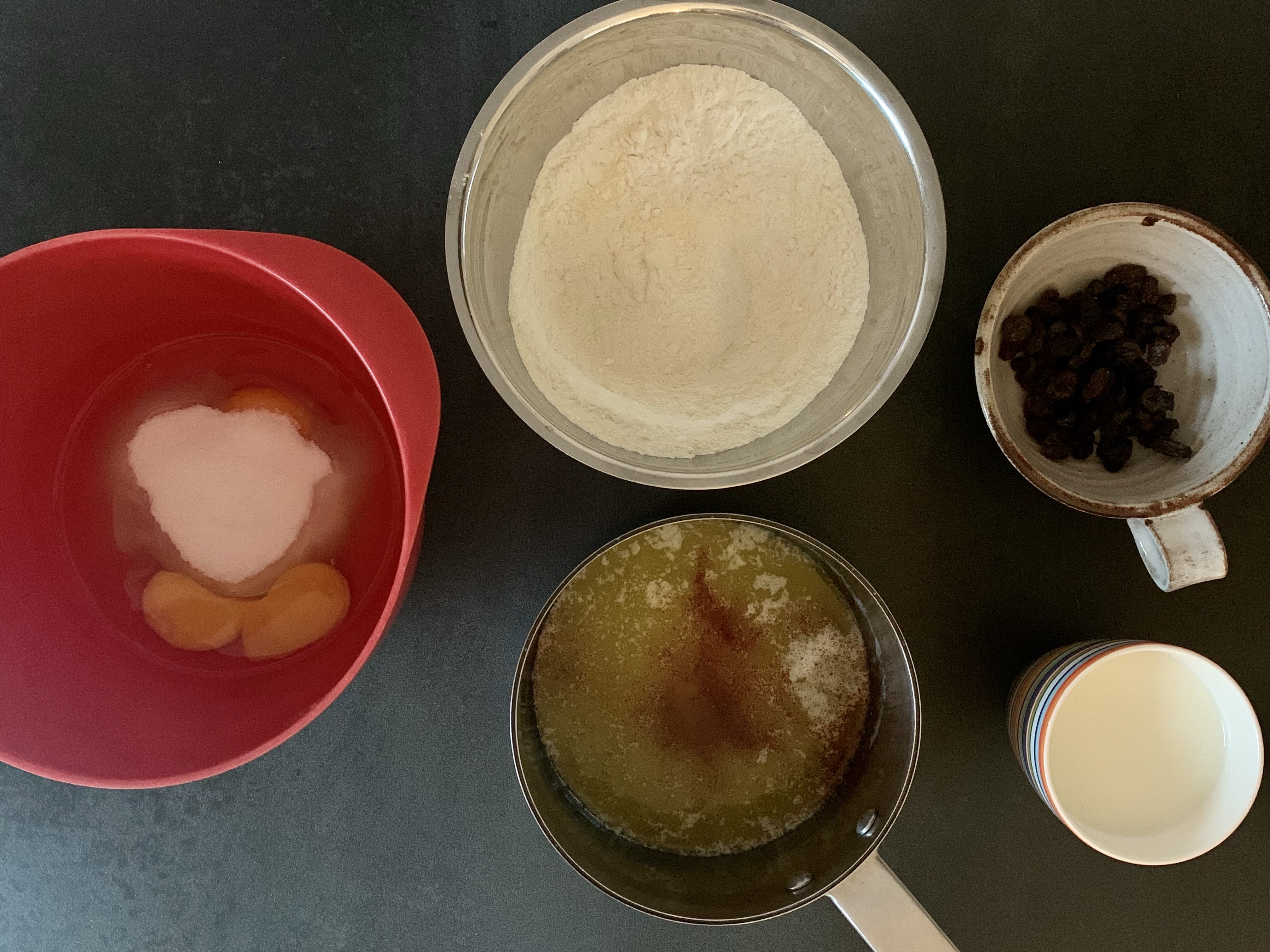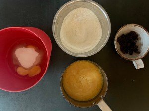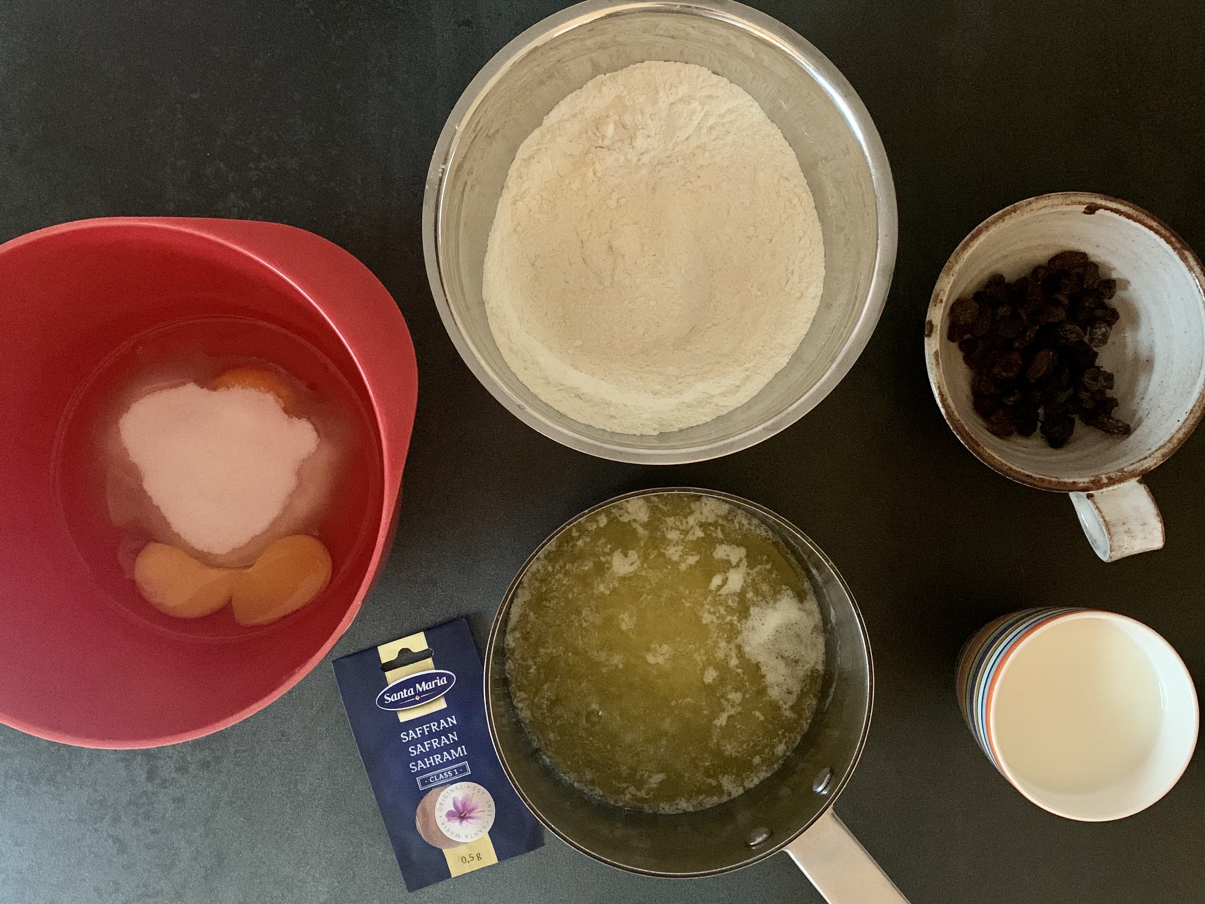 Jag använder mitt vanliga basrecept men plockar bort vanilj och citron och tillsätter saffran och russin.