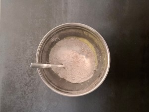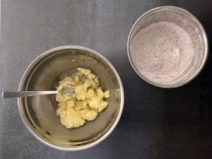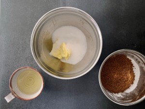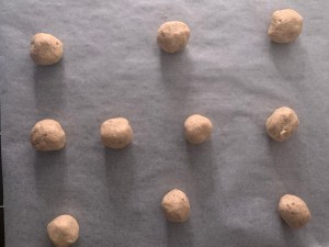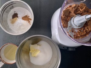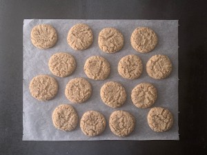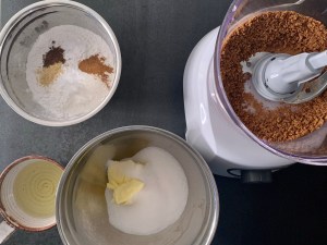Börjar med att krossa pepparkakorna i en matberedare, till smulor. Väger upp smör och socker i en bunke. De övriga torra ingredienserna, samt smulor och kryddor väger jag upp och blandar i en skål. Sen blandar jag smör och socker med en gaffel, tillsätter olja och blandar till en jämn massa. Efter det tillsätter jag de torra ingredienserna och blandar samman allt. Väger upp 25g bitar och rullar till bollar som jag sprider ut på två bakplåtsklädda plåtar och bakar av en i taget.
