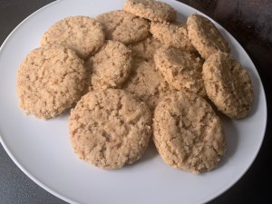 Låter de svalna ett par minuter på plåten innan jag drar över hela bakplåtspappret med kakorna på ett galler. Tiden på plåten efter ugn är för att de ska börja stelna, nybakade torra kakor är oftast rätt sköta precis när de kommer ur ugnen. När kakorna svalnat förvarar jag dem i en lufttät burk.