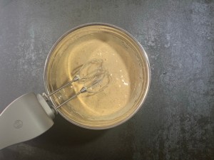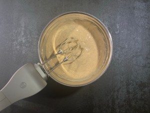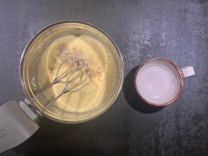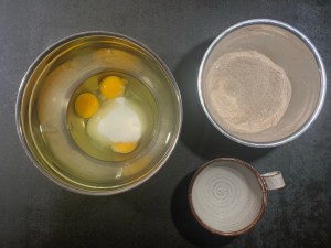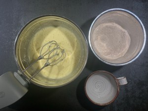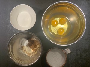 Jag börjar med att väga upp ägg i en bunke och socker i en skål. Sen väger jag upp de andra torra ingredienserna i en skål och blandar dem med en gaffel. Värmer vatten i vattenkokaren och förbereder en plåt med bakplåtspapper.