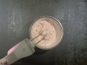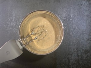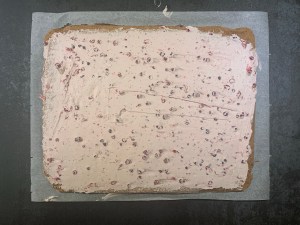 När kakan står i ugnen vispar jag grädden hård med bakpulvret. Sen tillsätter jag lingonen och vispar på låg hastighet. Sätter in lingongrädden i kylen tills kakan svalnat.