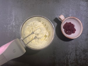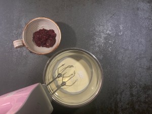 Efter det väger jag upp grädde, sylt och bakpulver och sätter åt sidan.