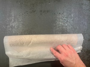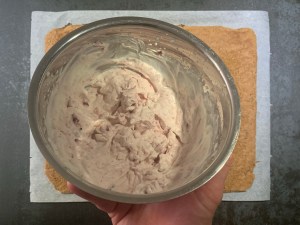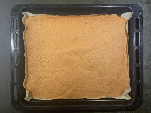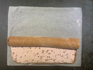 När kakan svalnat breder jag ut lingongrädden i ett jämnt, tunt lager och rullar den tight mot mig. Rullar in den i bakplåtspappret och lägger den i kylen.