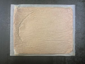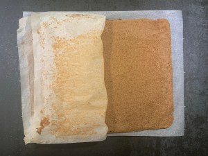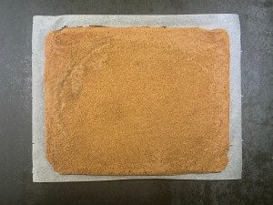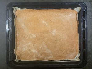 Efter att kakan kommit ur ugnen strör jag socker ovanpå och vänder sen upp den med den sockrade ytan på ett nytt bakplåtspapper. Efter det drar jag försiktigt av bakplåtspappret. jag börjar alltid med att försiktigt lossa i kanterna.