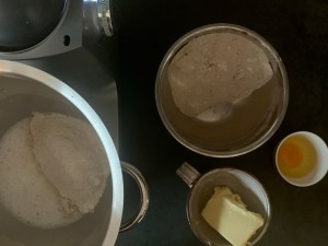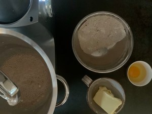 Stanna maskinen och tillsätt smör, ägg och resten av mjölet, kör samman degen och när mjölet är inarbetat öka farten till lite över medel och kör i 4min