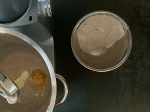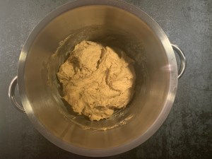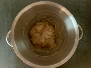 Skrapa av degen från vingen/spaden och skrapa ihop allt till en boll i bunken, plasta och låt jäsa i rumstemperatur ca 60min, tills den är dubbelt så stor. Tiden beror på temperatur i rummet