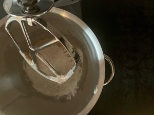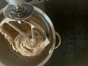Tillsätt hälften av mjölblandningen och kör samman i maskinen, viktigt att använda vingen