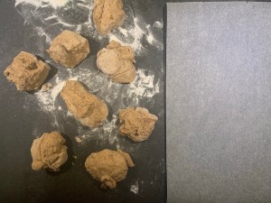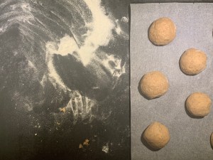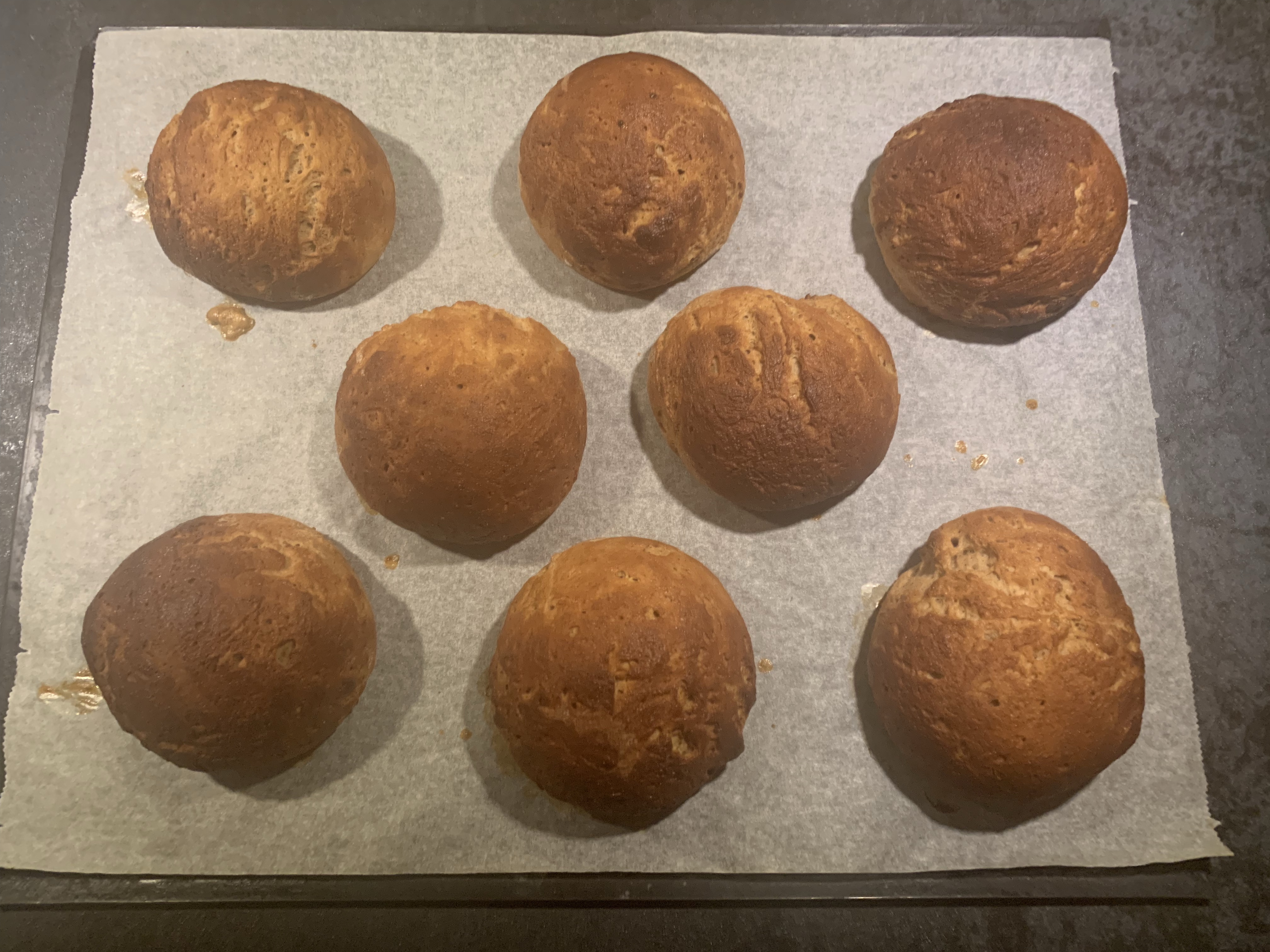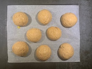 Dela degen i 8 bitar á 100g, rulla till bollar och lägg på bakplåtspappersklädd plåt, plasta lätt så att degen har plats att jäsa