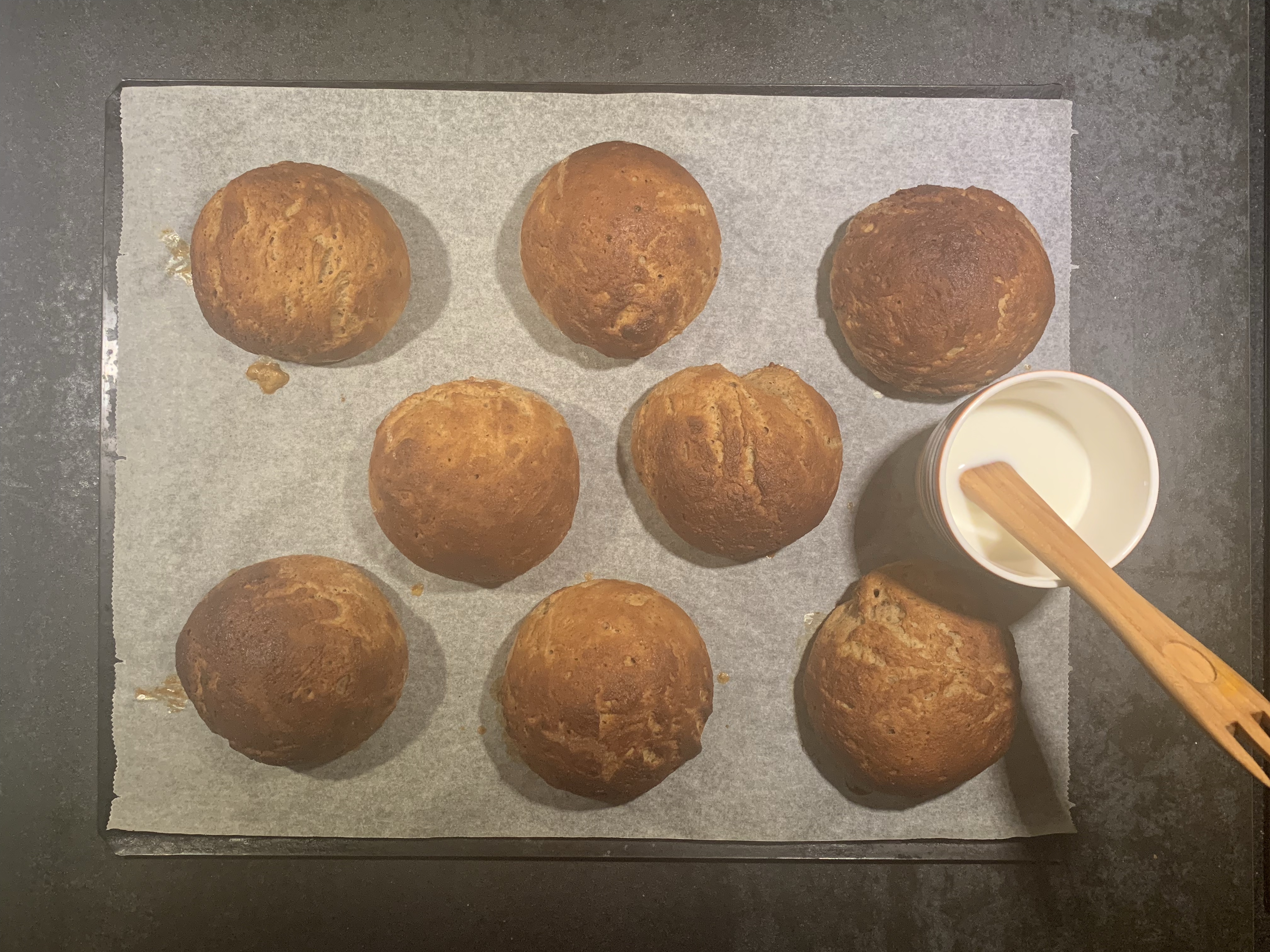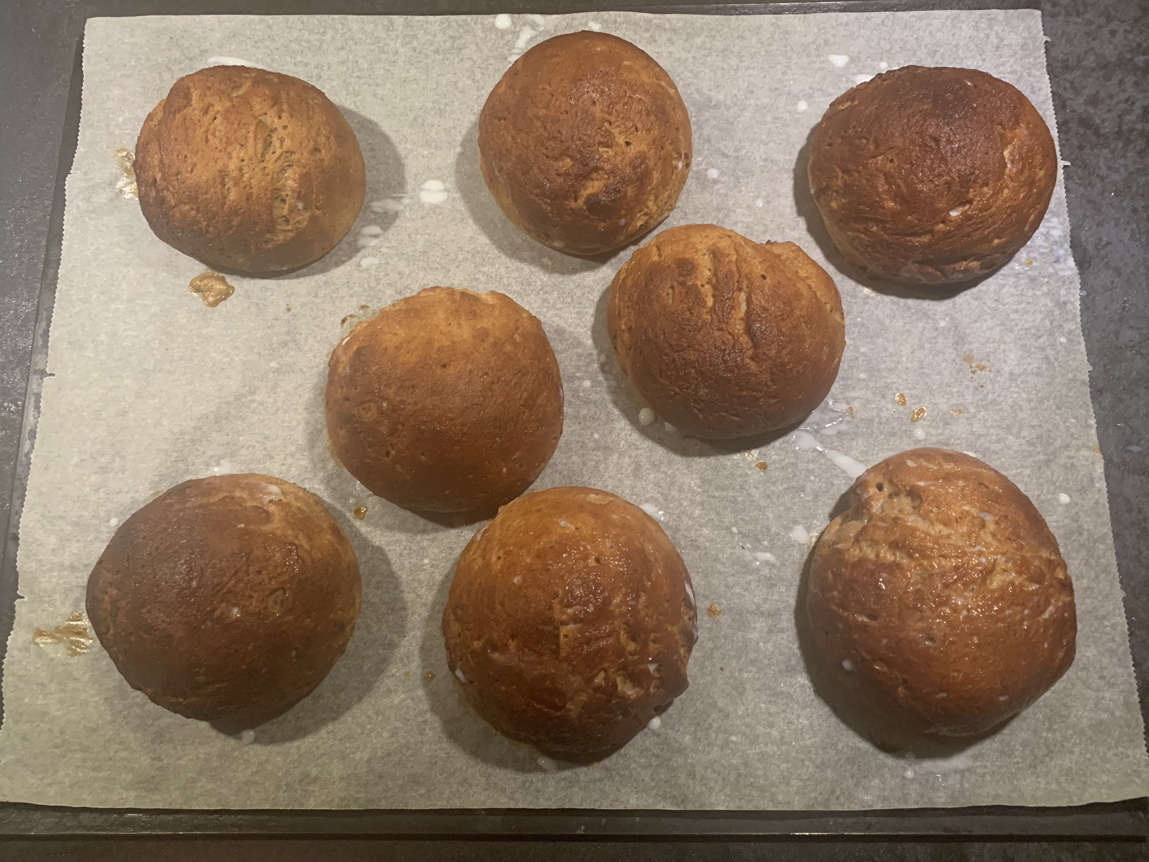 När bullarna jäst, pensla dem med uppvispat ägg, baka av och när de är färdiga så penslar man med mjölk och låter dem sen svalna på ett galler, innan man fyller dem.
