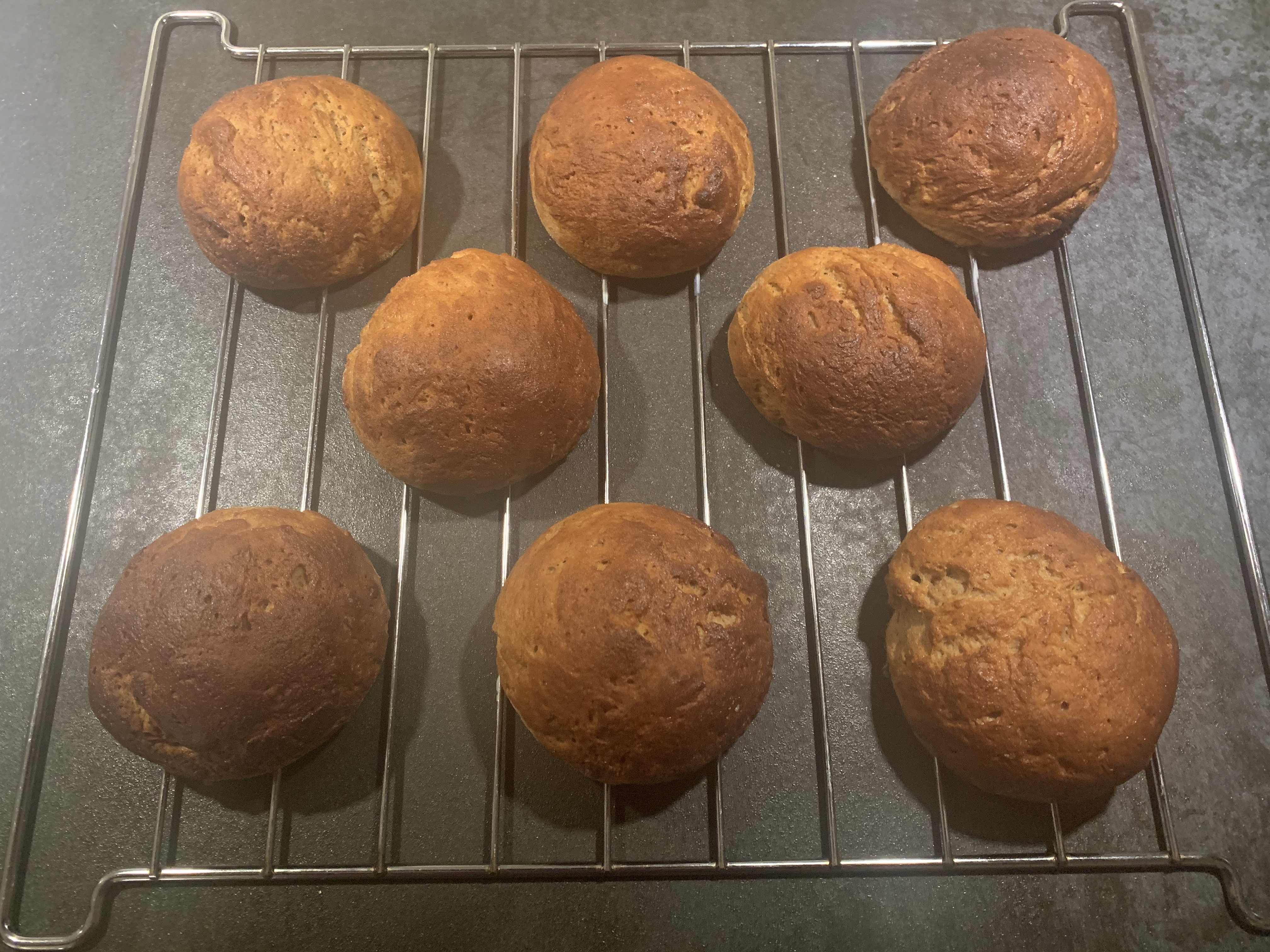 När de kommer ut ur ugnen pensla med mjölken och flytta sedan över dem på ett galler för att svalna. Jag låter mina svalna utan handduk