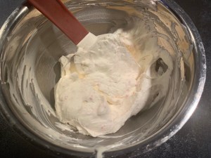 Grädden vispar jag med lite bakpulver och sist vänder jag ner krossad polkagris.