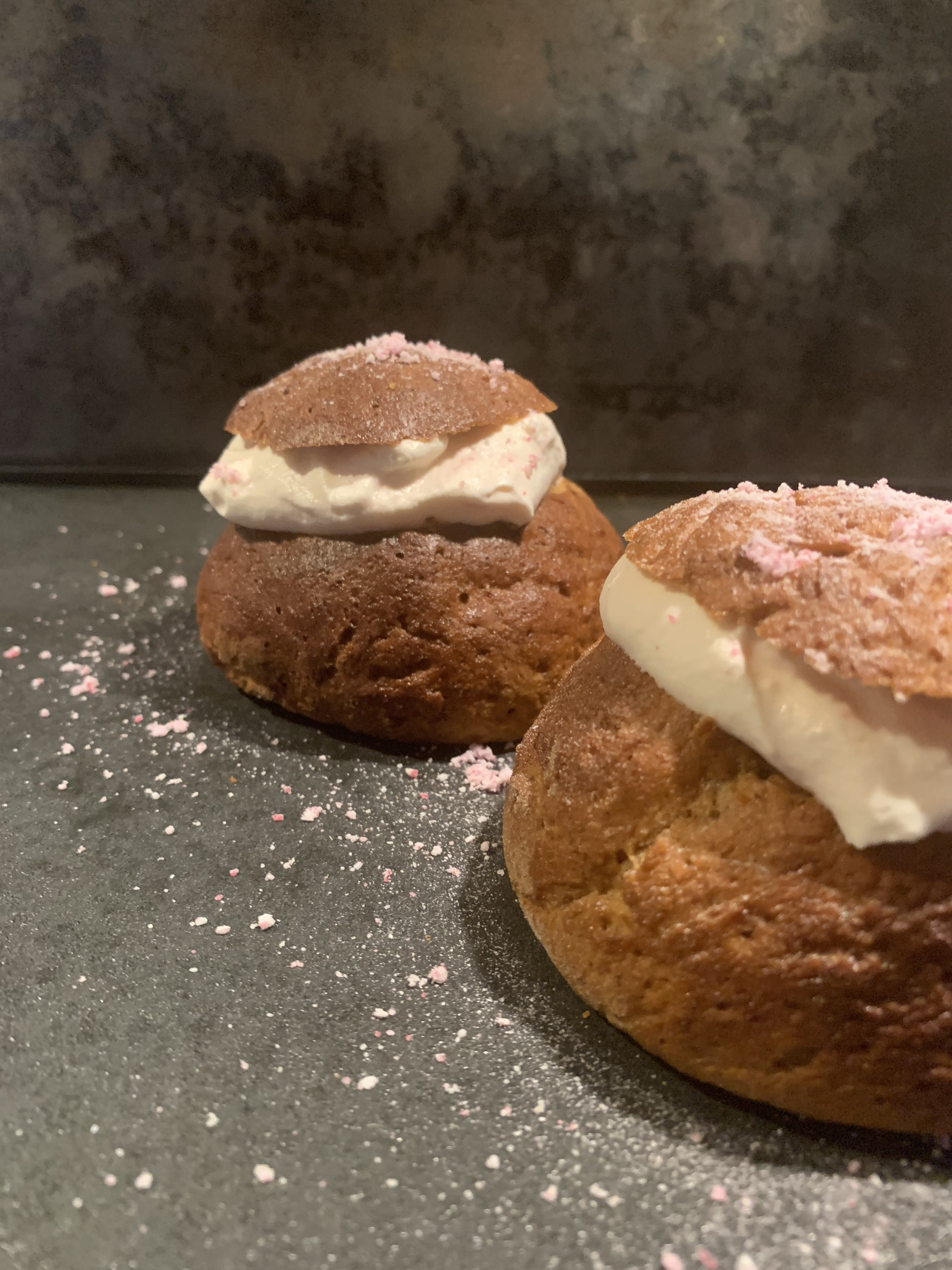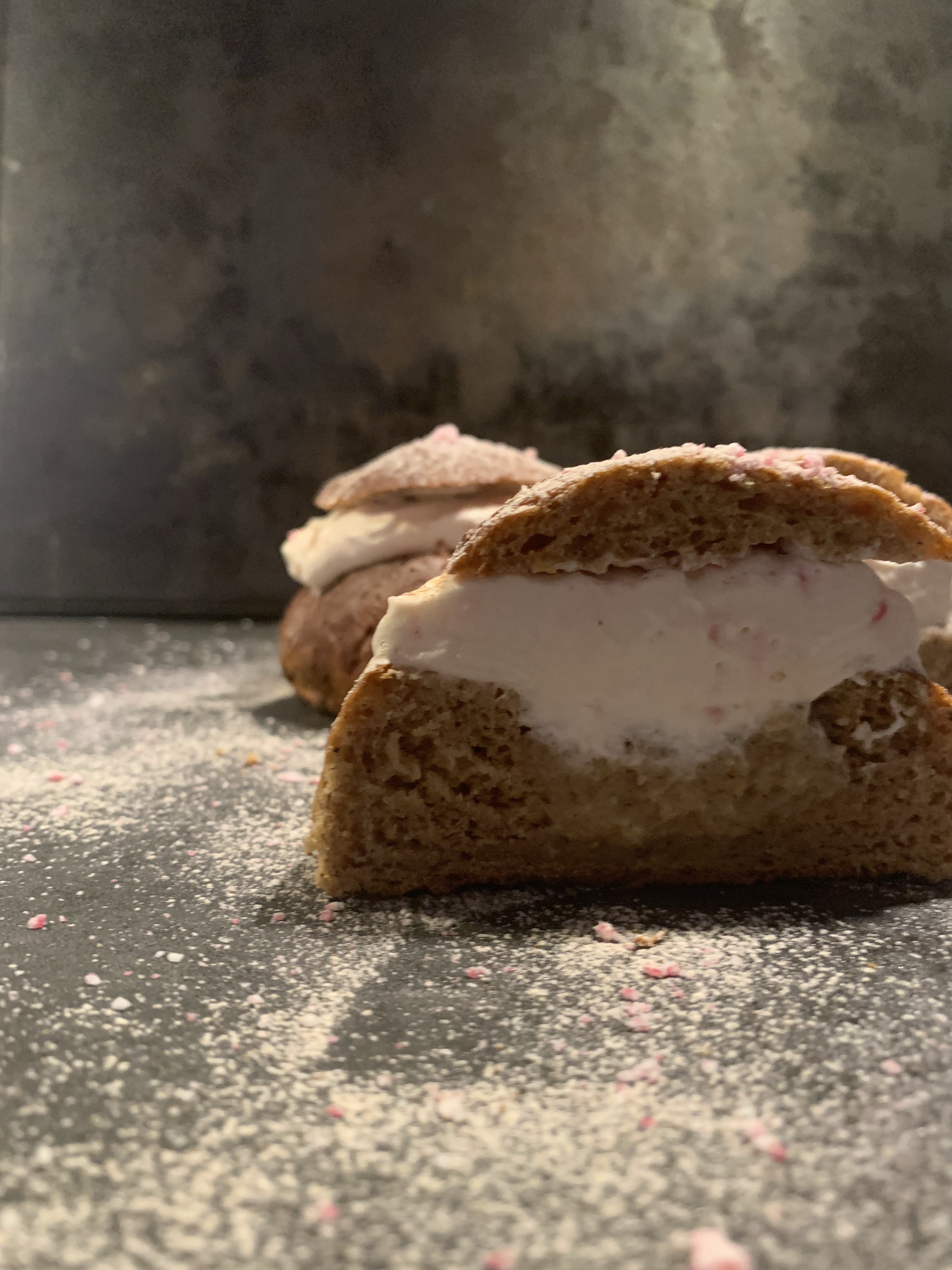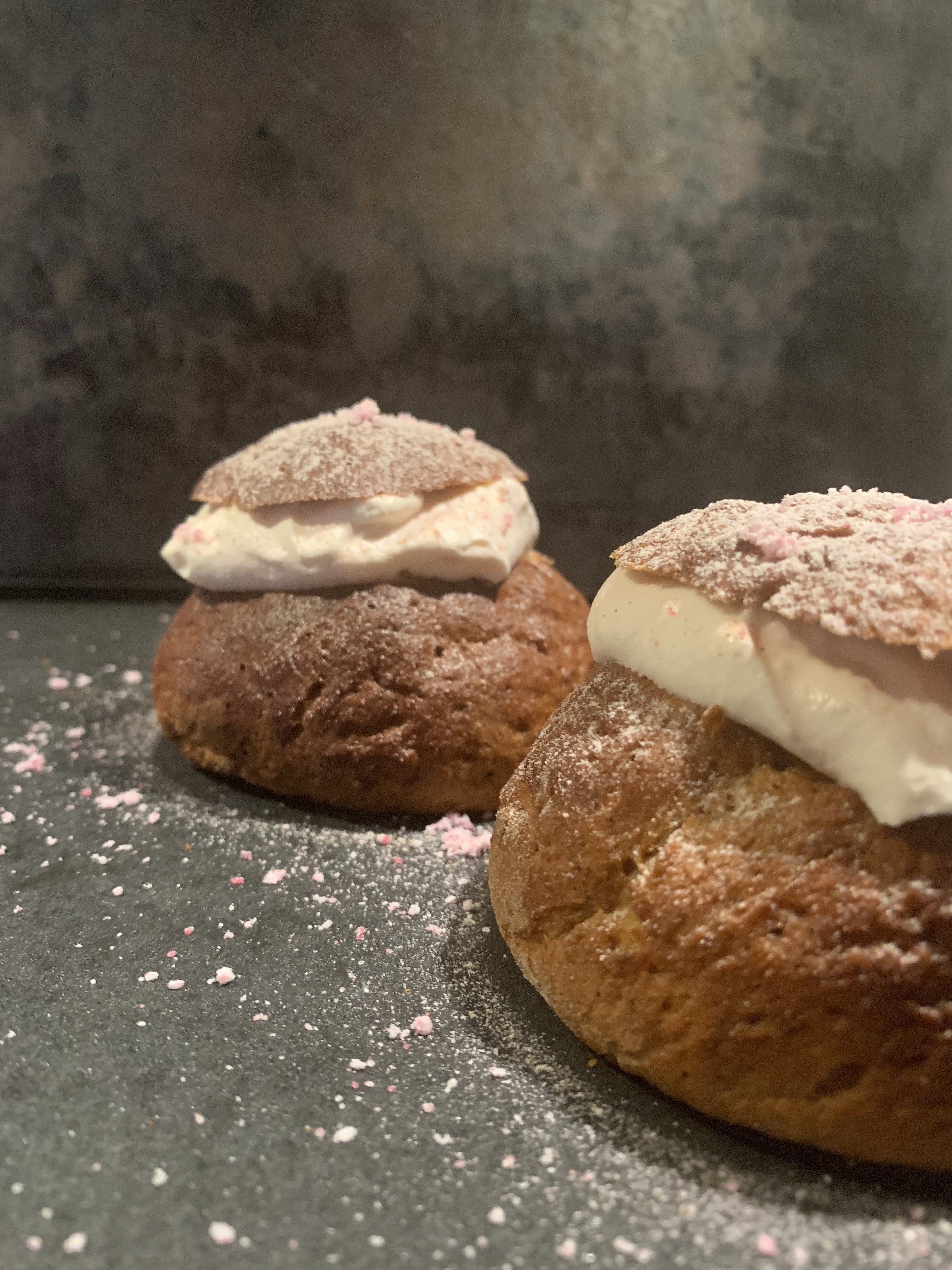 När bullarna kommit ur ugnen och svalnat så skär jag av locket, gröper ur brödet ur dem. Jag tar en del av brödet som jag blandar med grädde och hasselnötsmassa. Sen åker allt i spritspåse och jag fyller hålen. Efter det klickar jag på polkagrädde. Lägger locket ovanpå, pudrar med krossad polkagris och pepparkakskryddat florsocker.