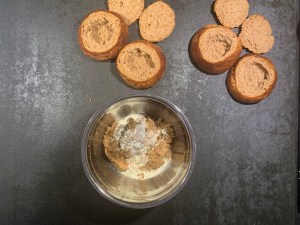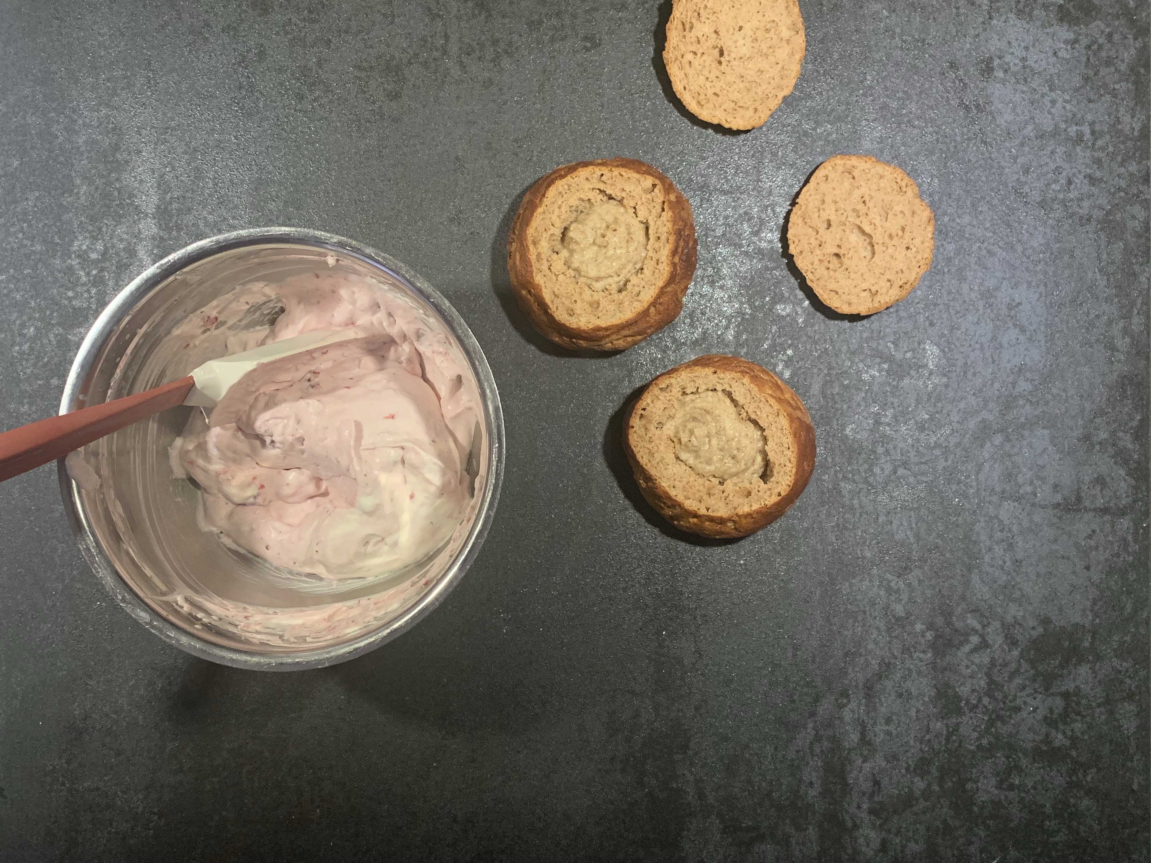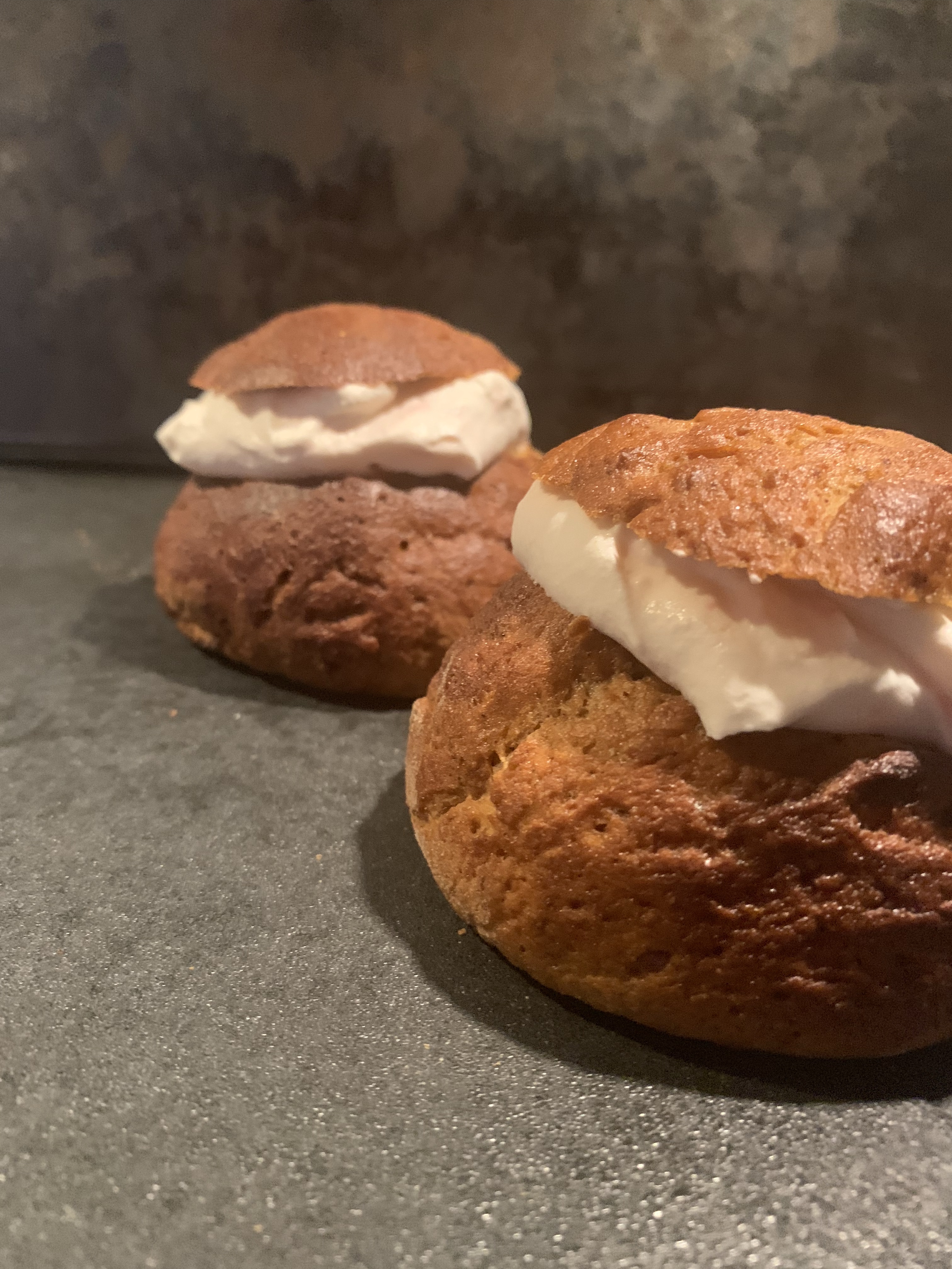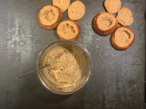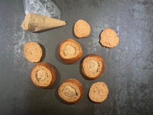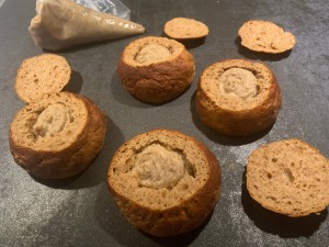 När bullarna kommit ur ugnen och svalnat så skär jag av locket, gröper ur brödet ur dem. Jag tar en del av brödet som jag blandar med grädde och hasselnötsmassa. Sen åker allt i spritspåse och jag fyller hålen. Efter det klickar jag på polkagrädde. Lägger locket ovanpå, pudrar med krossad polkagris och pepparkakskryddat florsocker.