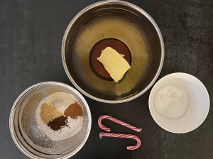 Jag har utgått från en variant på mina kolasnittar, adderat pepparkakskryddor och krrossat polkagris. Jag använder polkagrisstång när jag bakar, de är mycket lättare att krossa än de hårda godisklumparna.