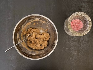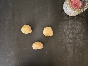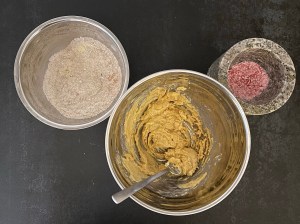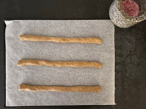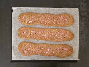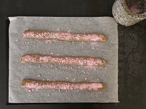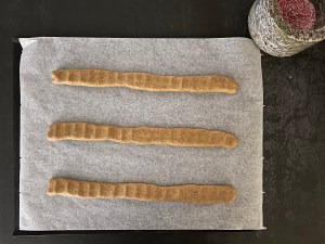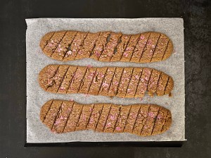 Smör, socker och sirap blandas med en gaffel. Alla torra ingredienser blandas i en skål och tillsätts sedan till smörblandningen. Blandar väl med gaffeln, delar upp i tre lika stora bitar och rullar till korvar. Lägger korvarna på bakplåtsklädd plåt, plattar till dem lätt med fingrarna och strör över krossad polkagris. Bakar av och direkt när de kommer ur ugnen så delar man dem. Mitt tips är att använda en kniv, jag började med en degskrapa men polkagrisen fastnade i skrapan och resultatet ser ni i den översta, där några kakor är lite trasiga.