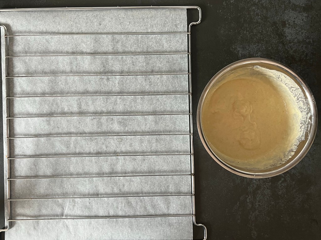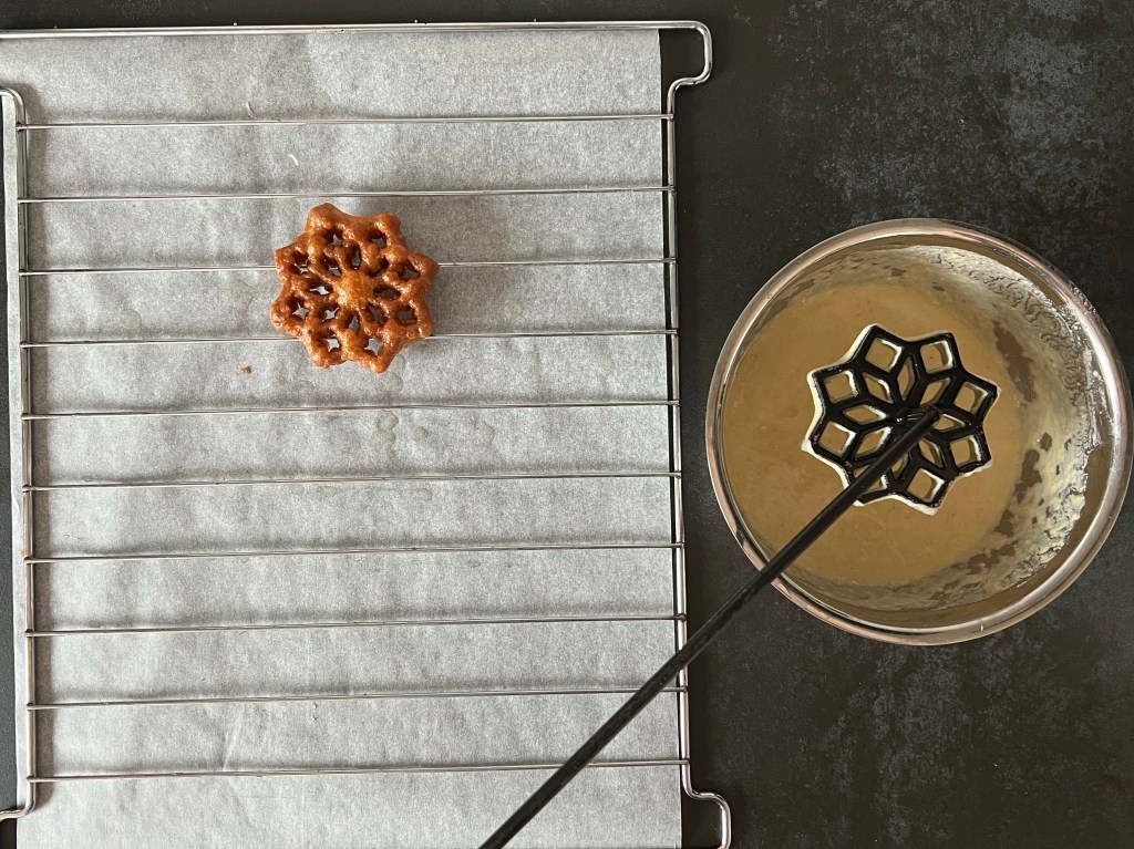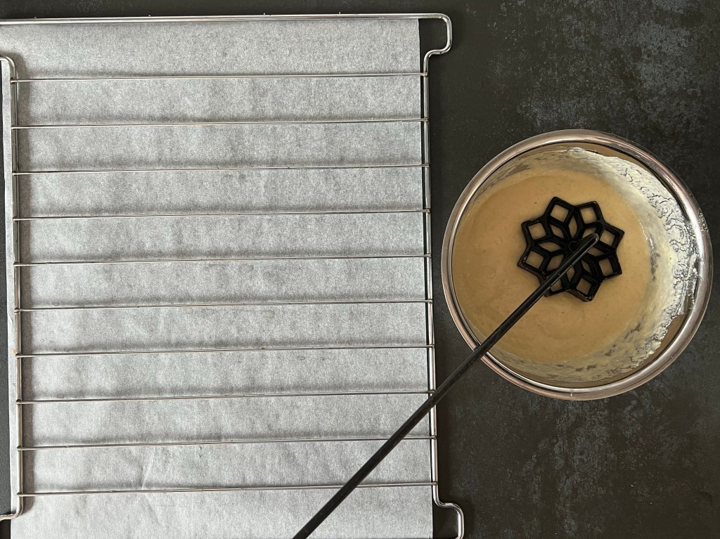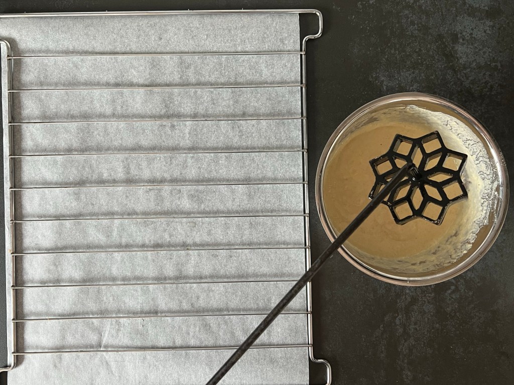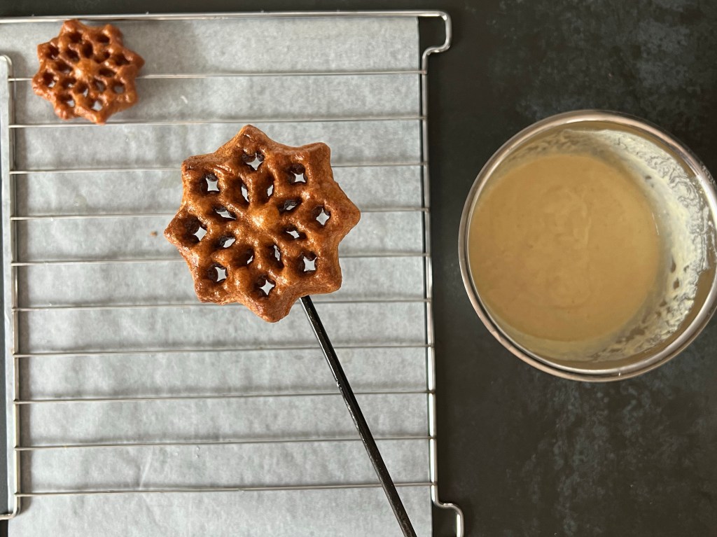 - Flytta den över ett galler, jag har mitt galler på ett bakplåtspapper. Ta försiktigt loss den, tänk på att järnet är ca 180°c, och att strävan är ganska skör. Har deg bubblat över kanten så ta en skalkniv och skär försiktigt bort, det, så att den är ren. Annars kommer du inte få av den.