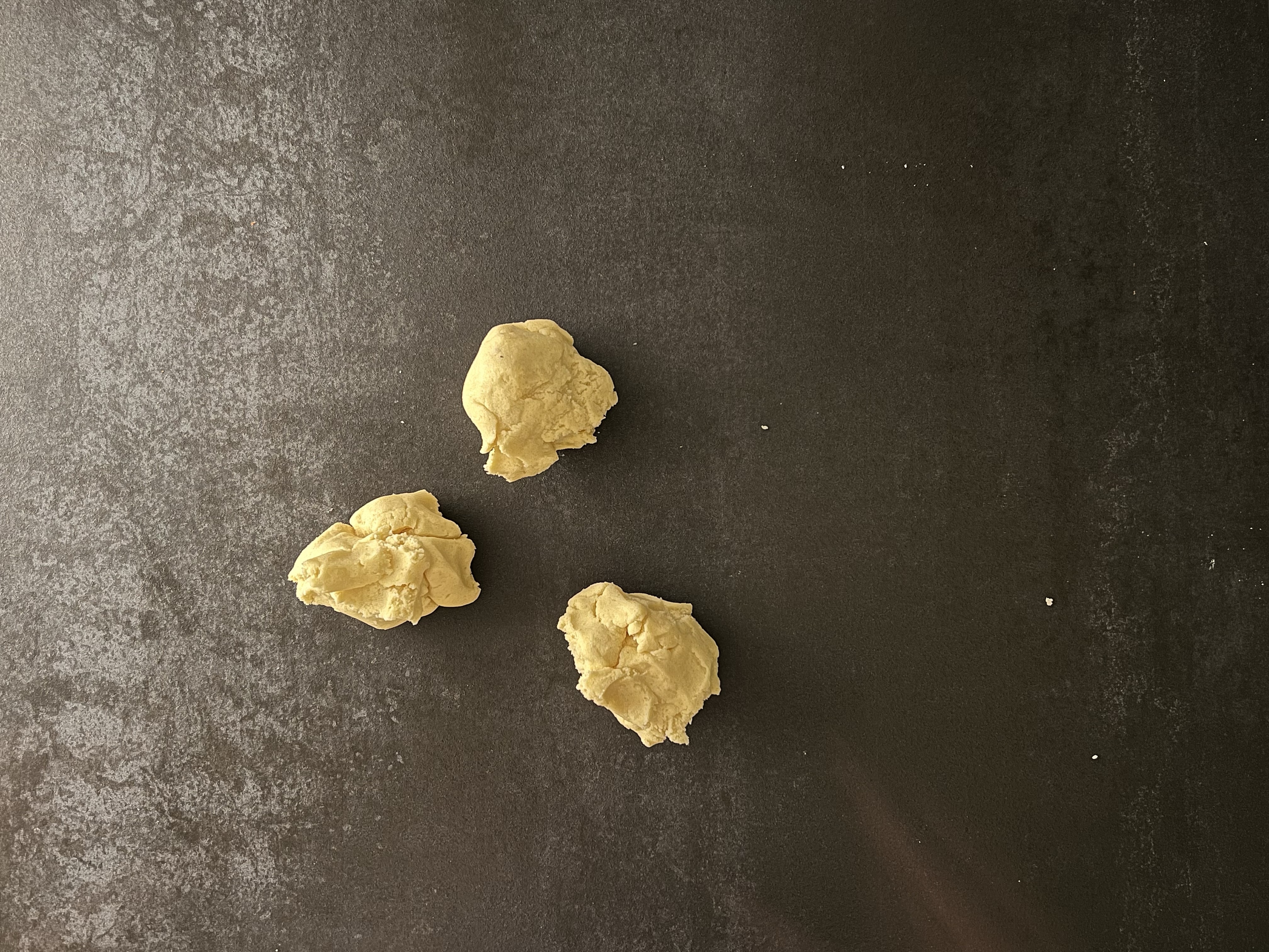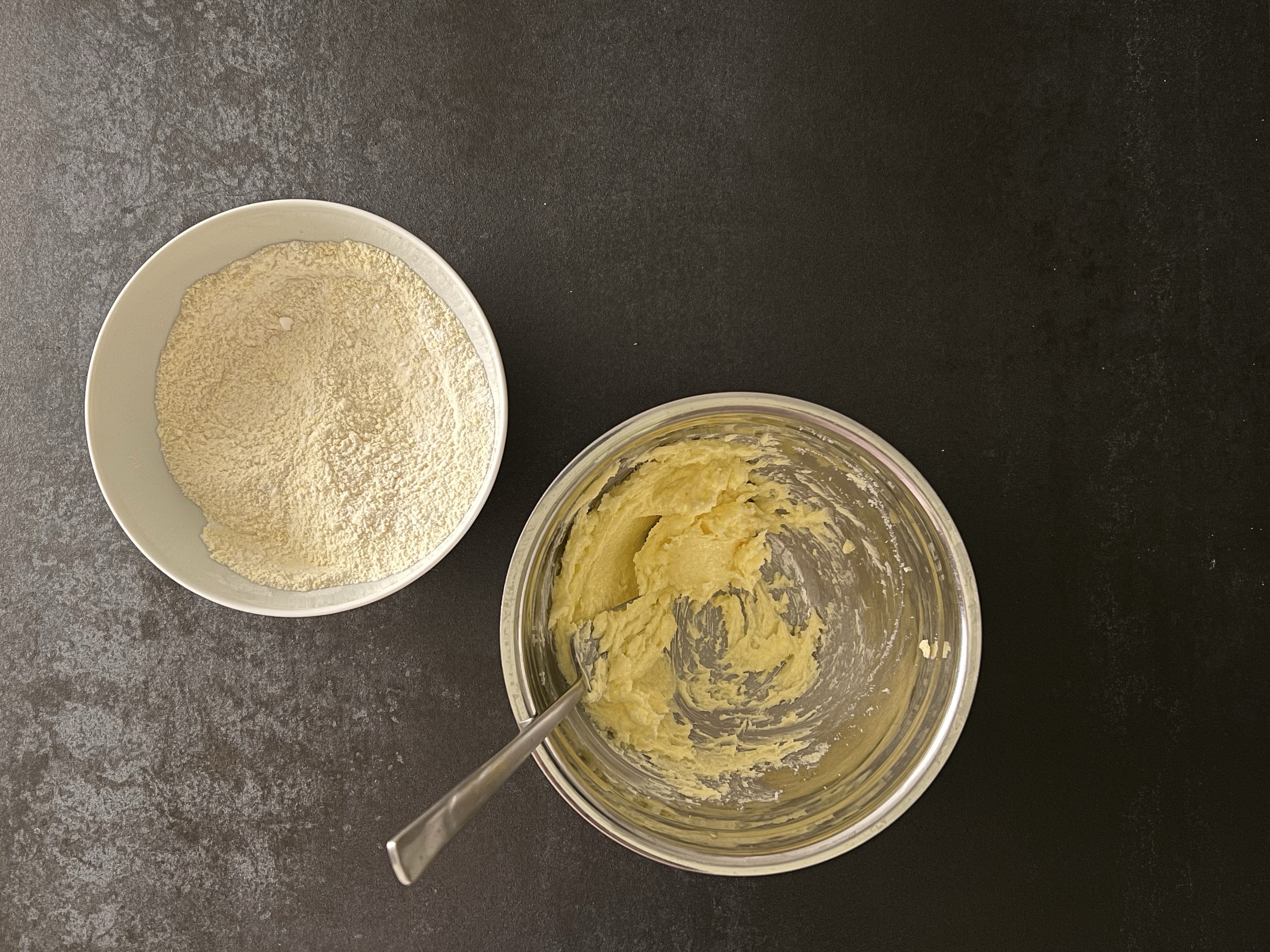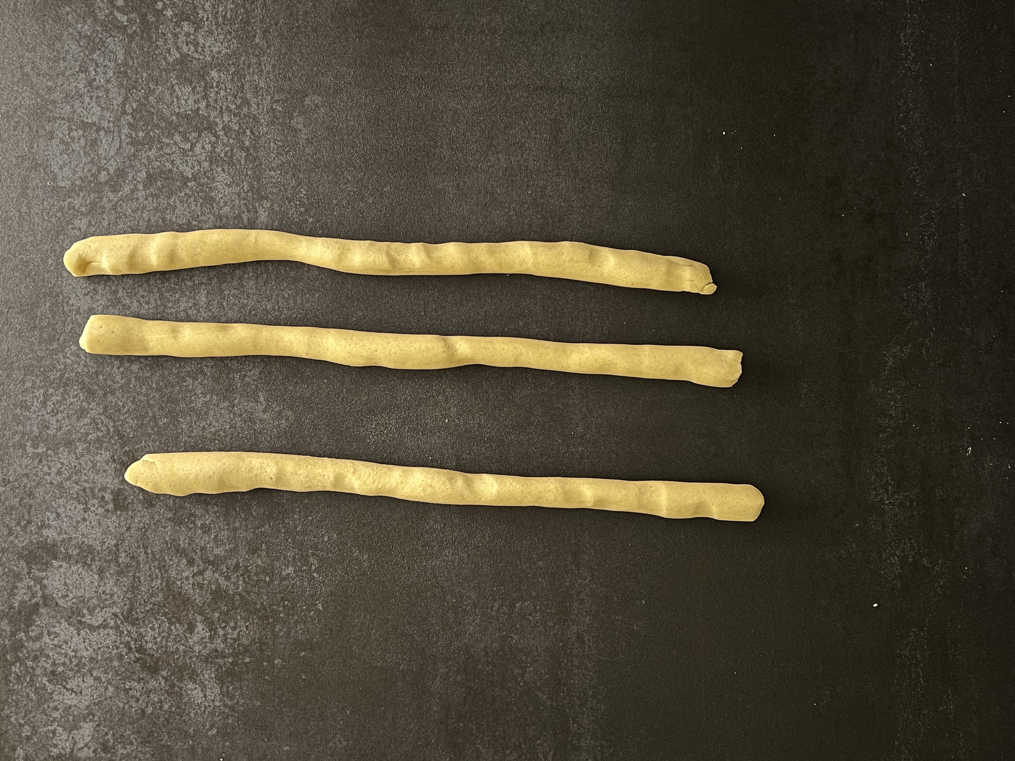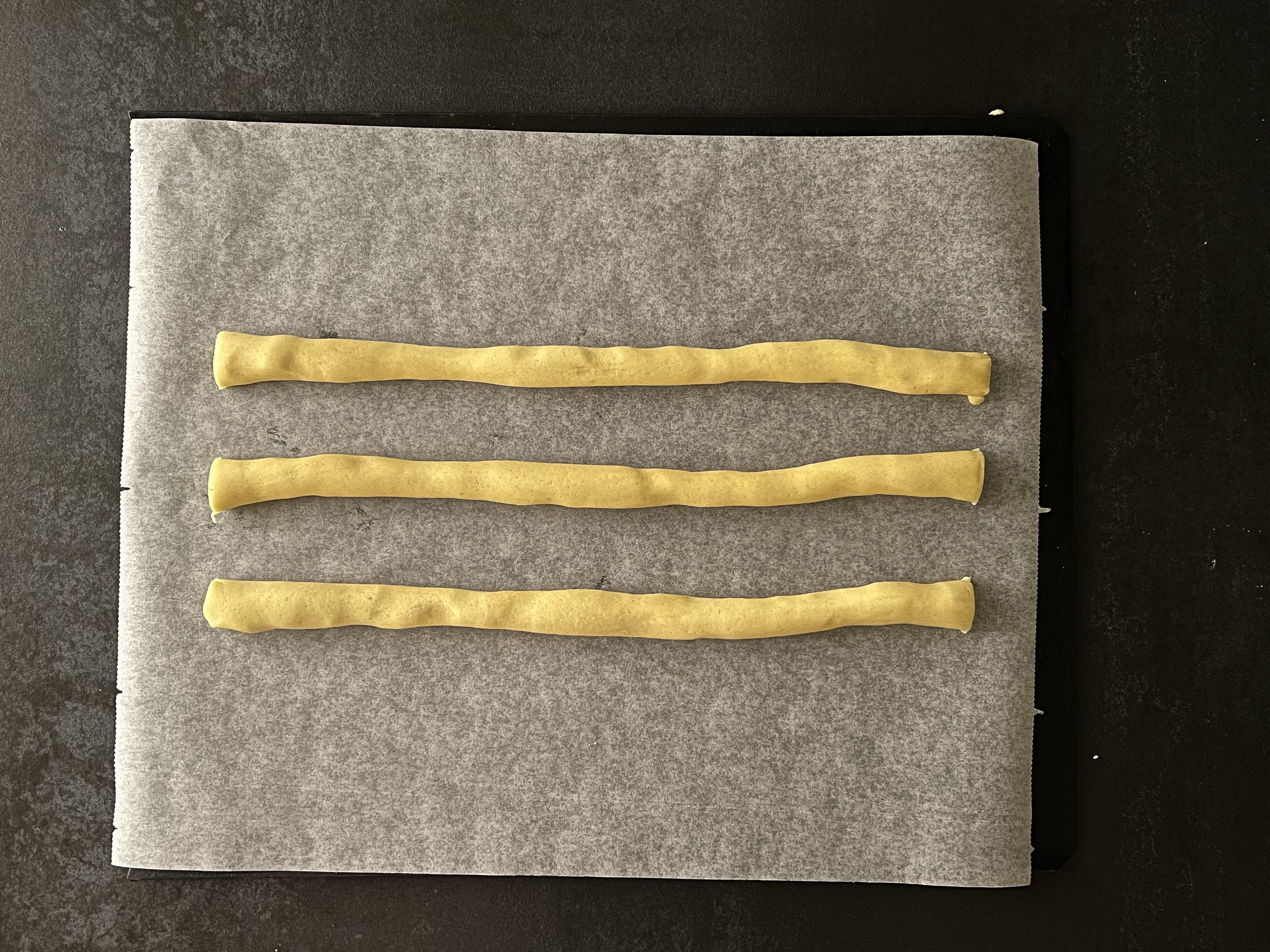 Först blandar jag rumsvarmt smör med strösocker, använder en gaffel. Tillsätter sen en egen mjölmix med lite mandelmjöl i och blandar till en gryning massa, med gaffeln. Sist knådar jag samman den för hand. Efter det väger jag upp den i 3x ca 100g och rullar till finertjocka längder som jag lägger på en bakplåtsklädd plåt och ställer i kylen i ca 30min.