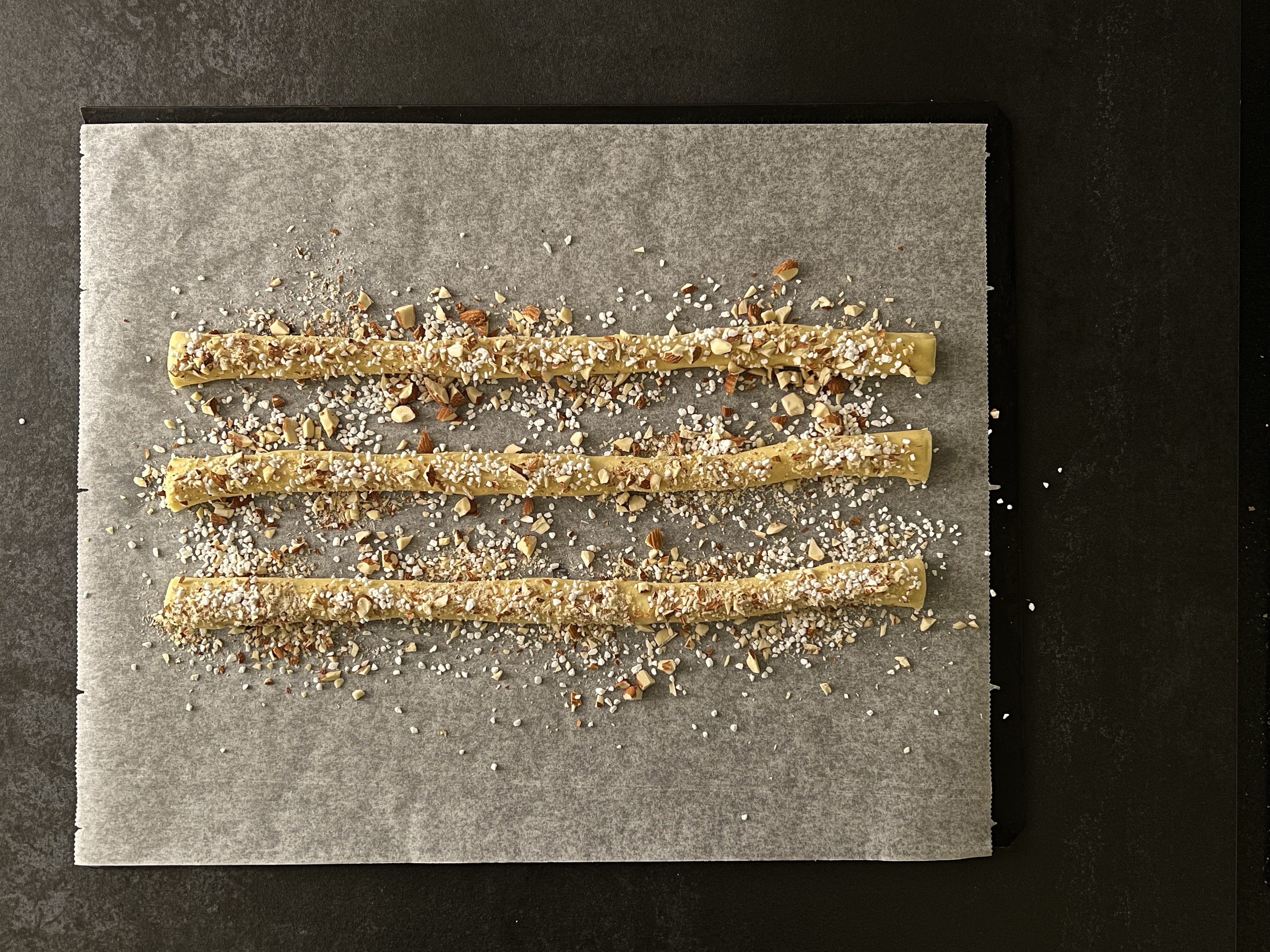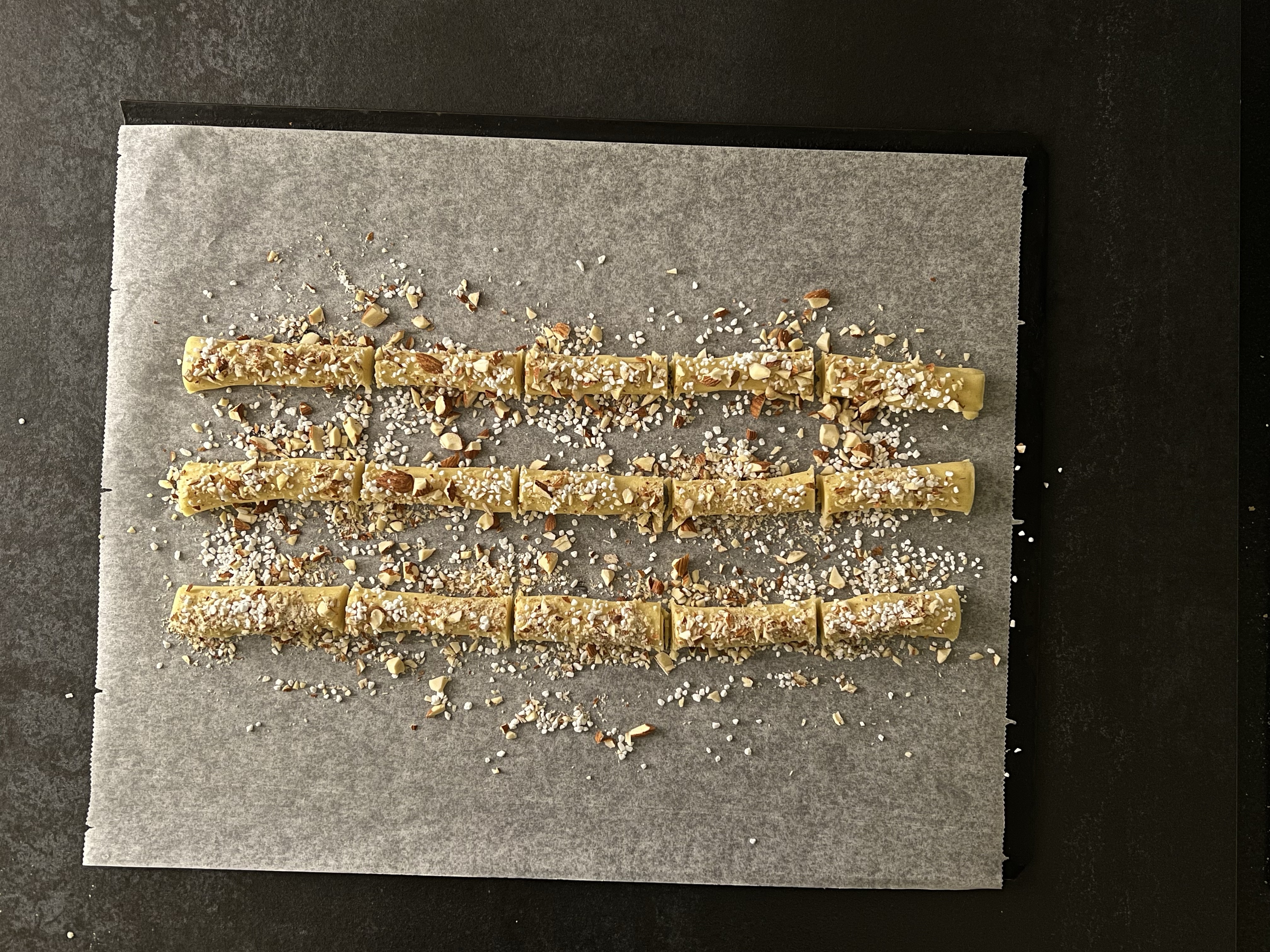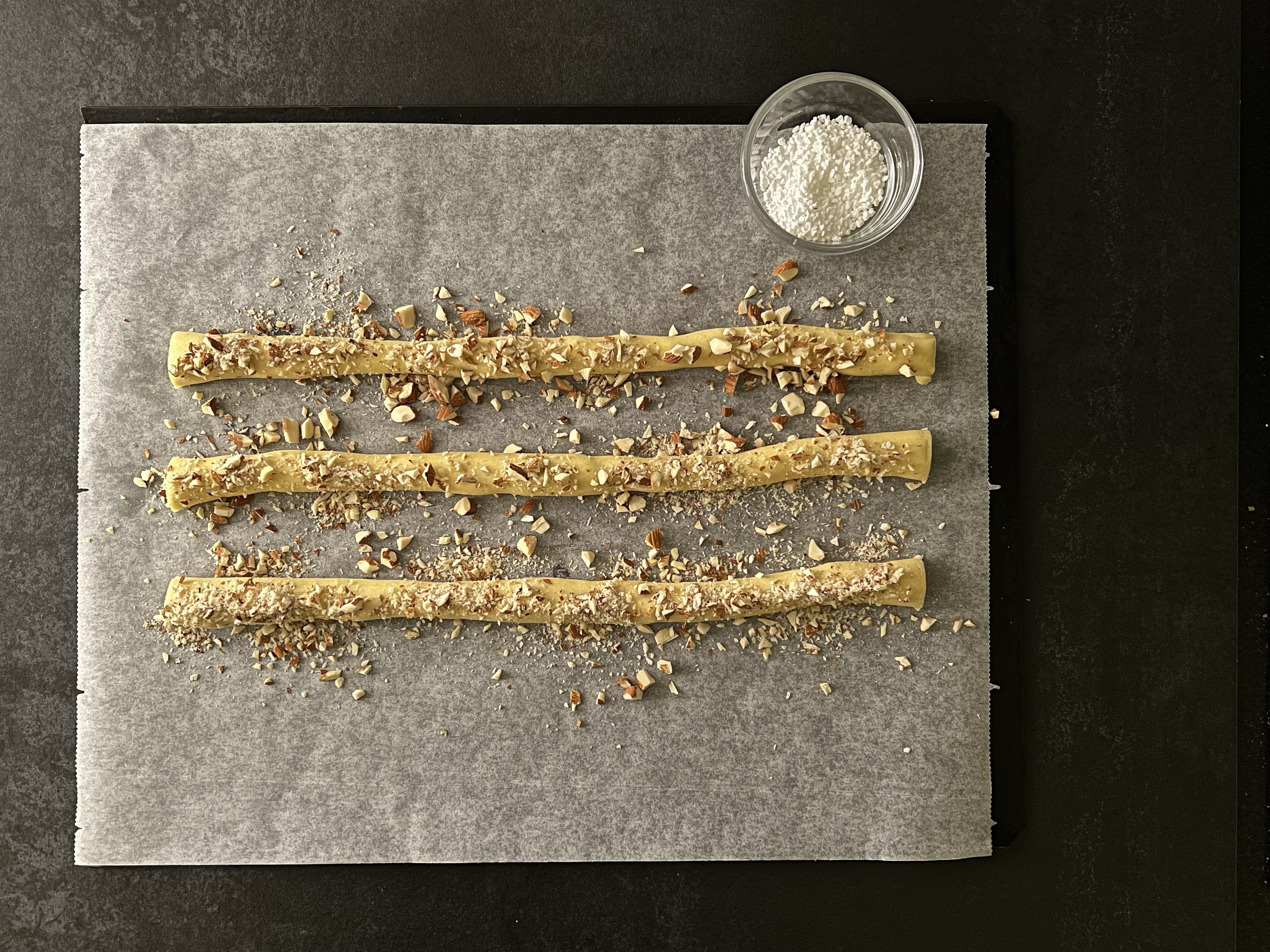 När kakan vilat i kylen hackar jag mandel, vispar en äggula och väger upp pärlsocker. Sen penslar jag längderna med äggvita och strör över rikligt med mandel och pärlsocker. Trycker lätt till med fingrarna och delar sen i 6-7cm längder innan plåten åker in i ugnen.
