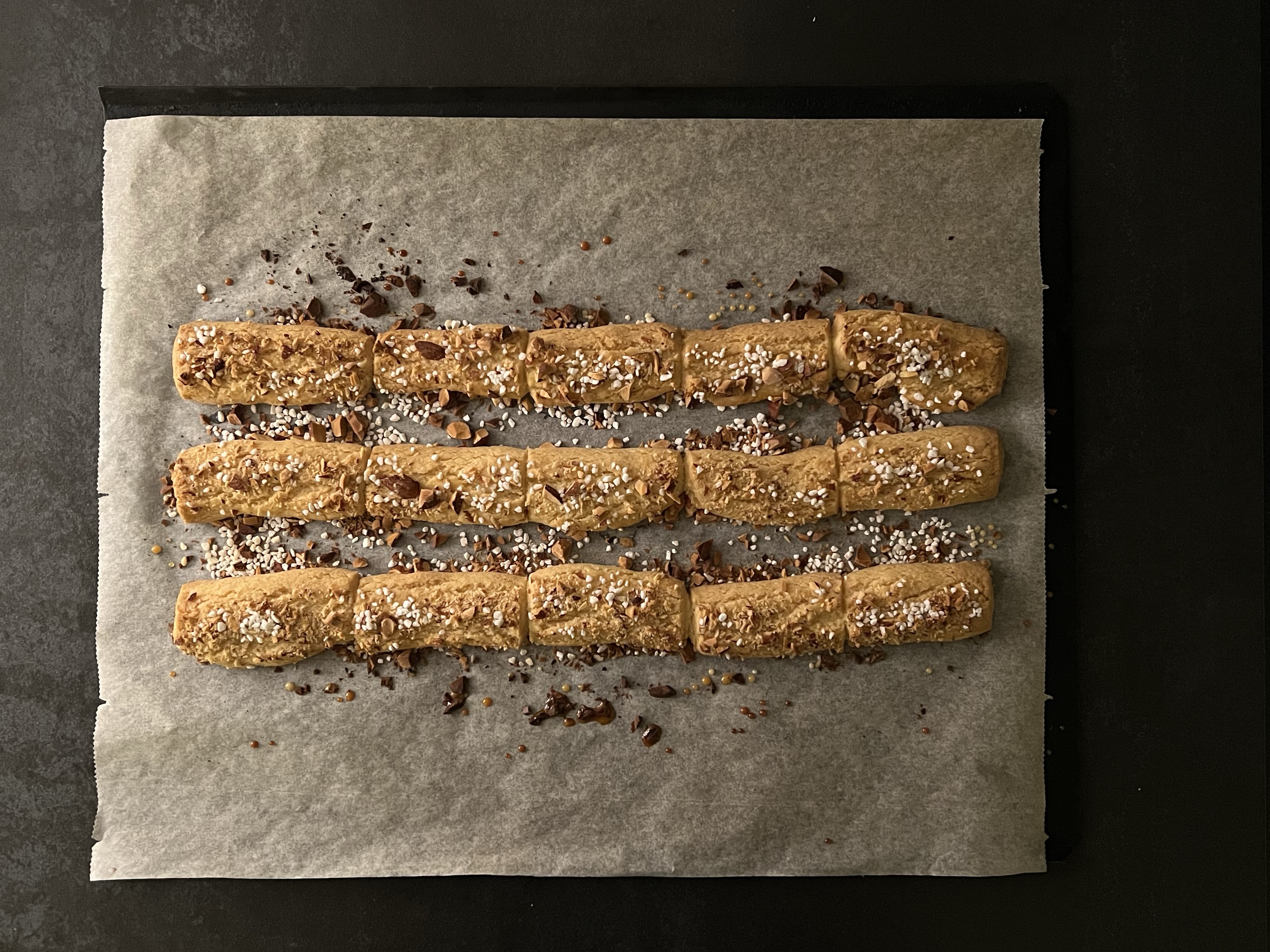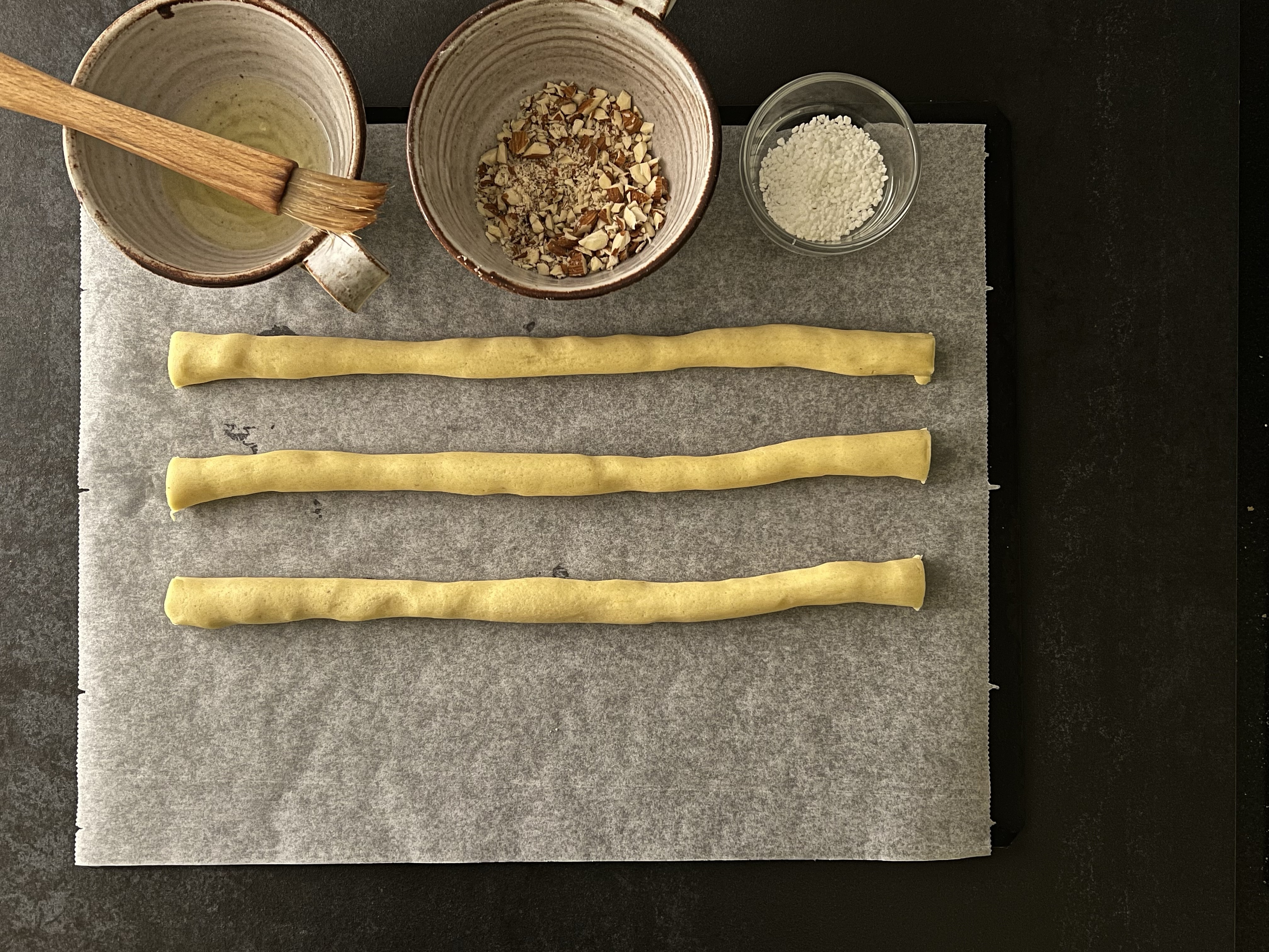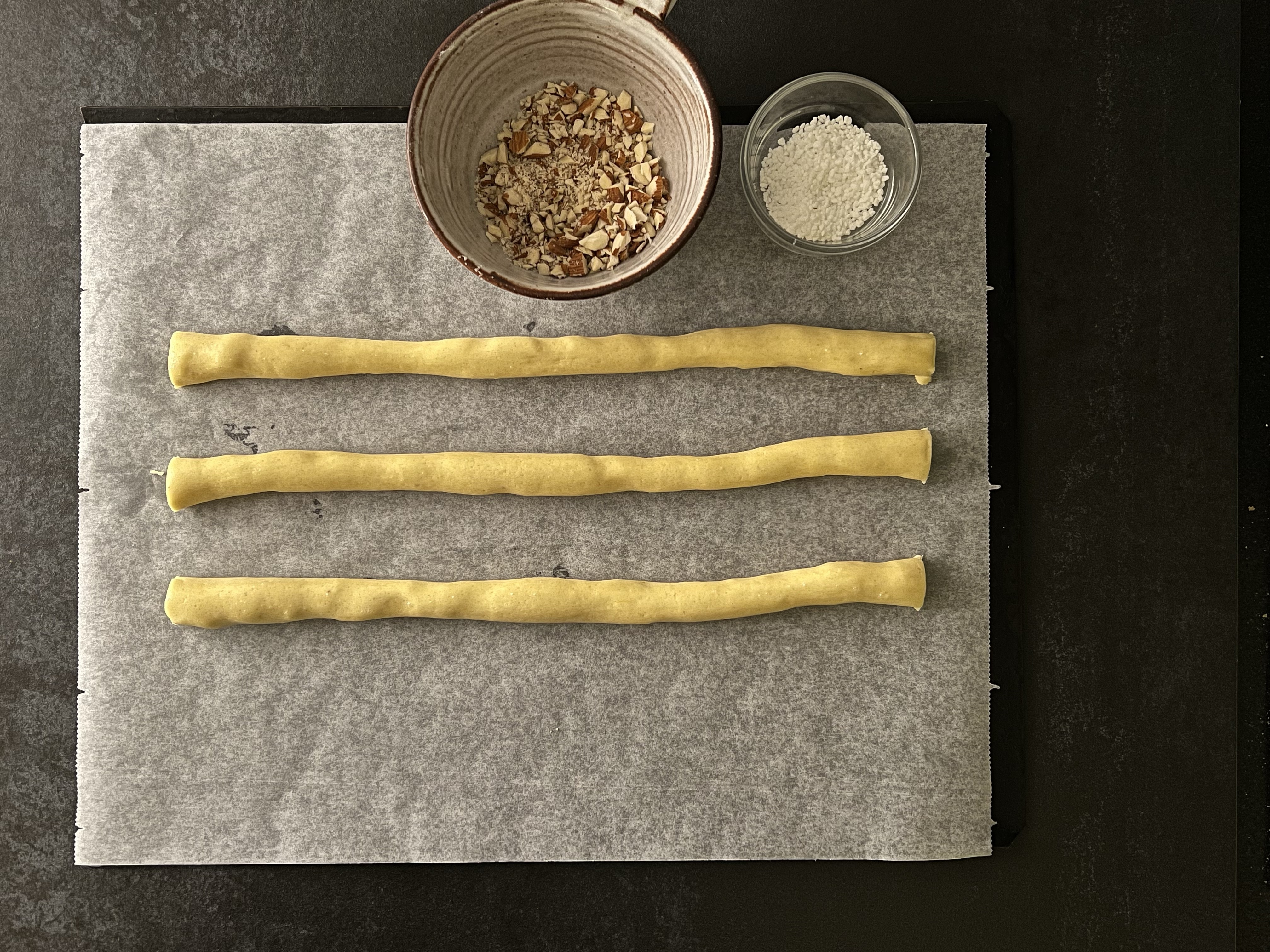 När kakan vilat i kylen hackar jag mandel, vispar en äggula och väger upp pärlsocker. Sen penslar jag längderna med äggvita och strör över rikligt med mandel och pärlsocker. Trycker lätt till med fingrarna och delar sen i 6-7cm längder innan plåten åker in i ugnen.
