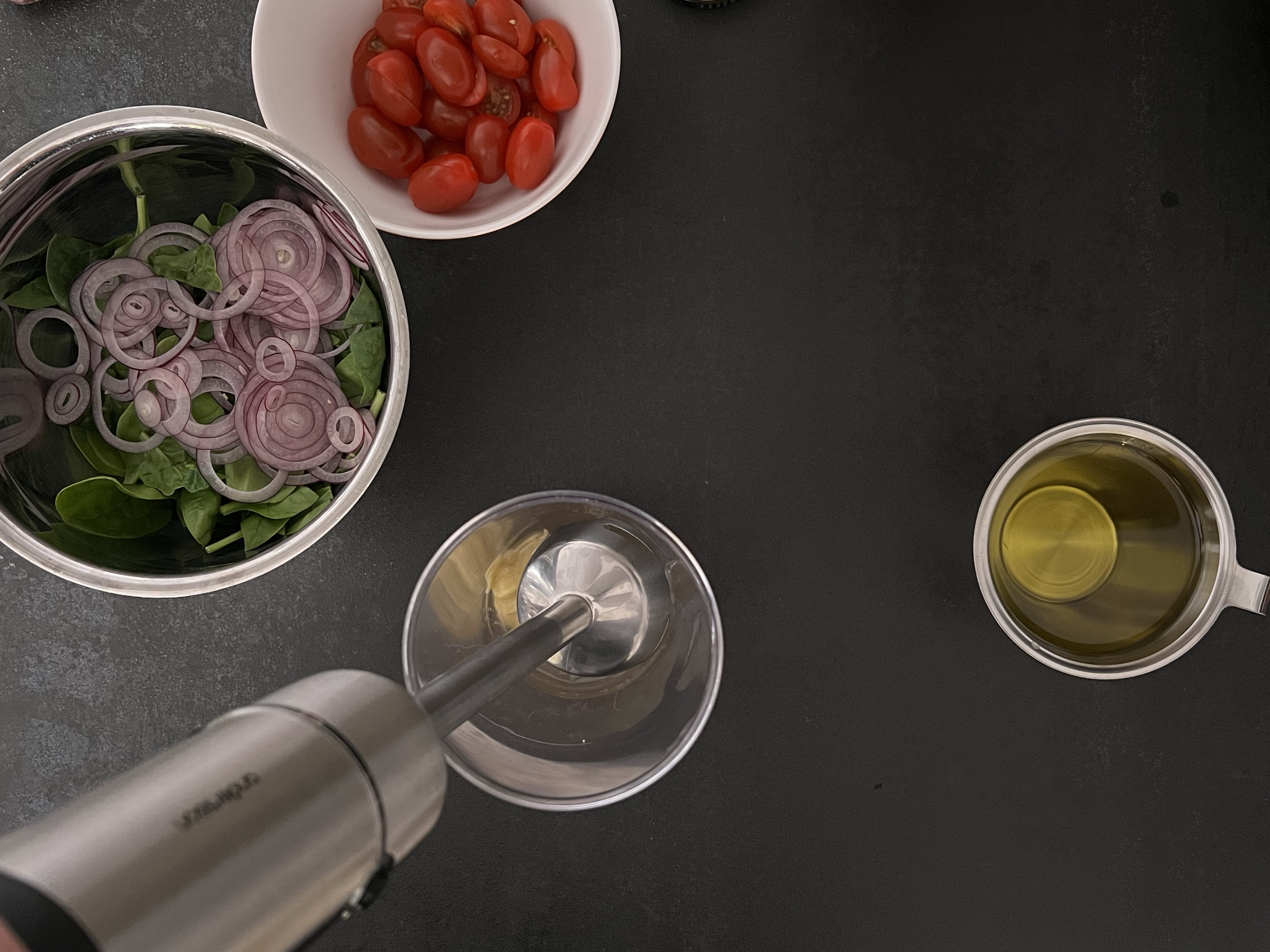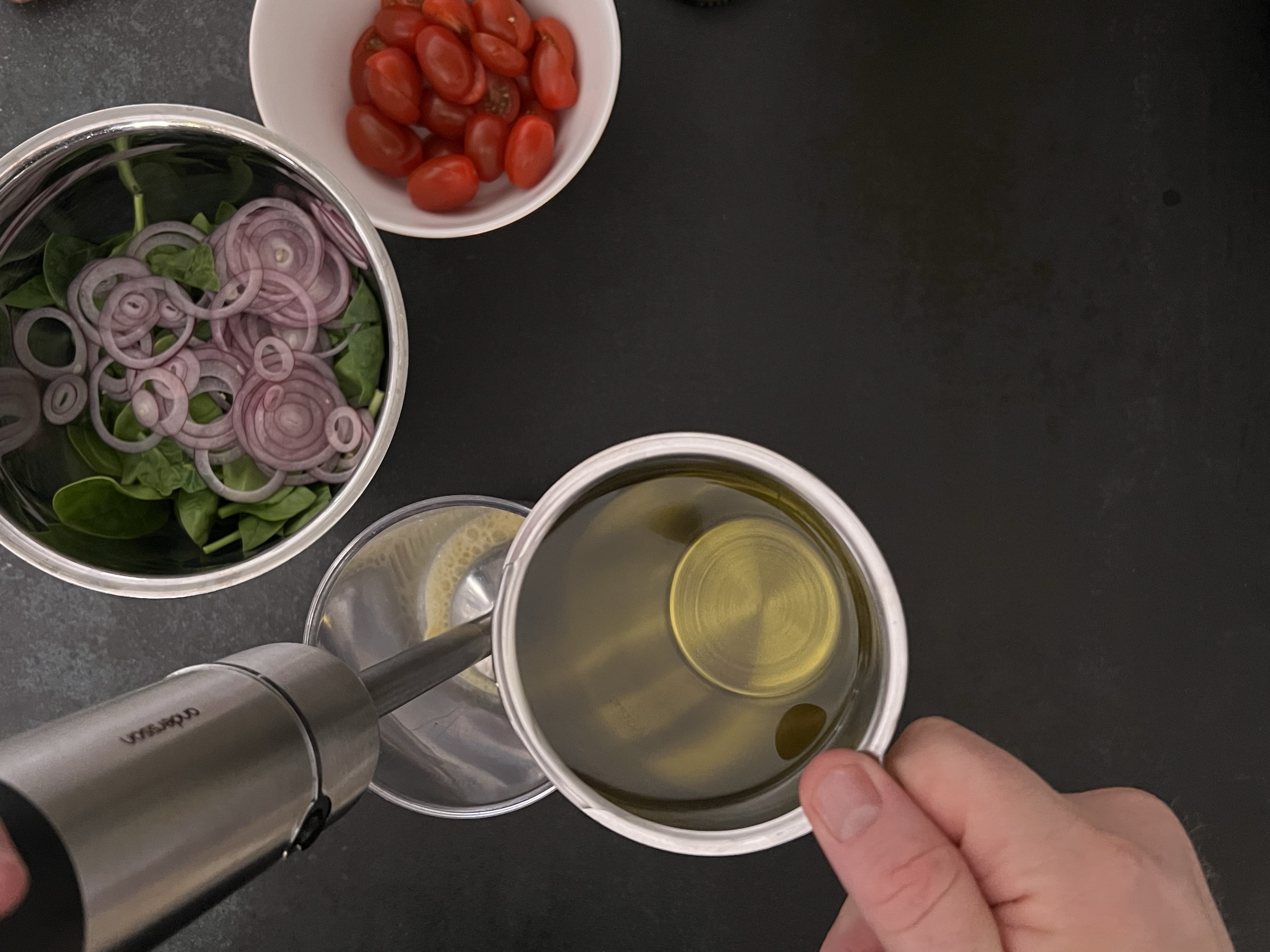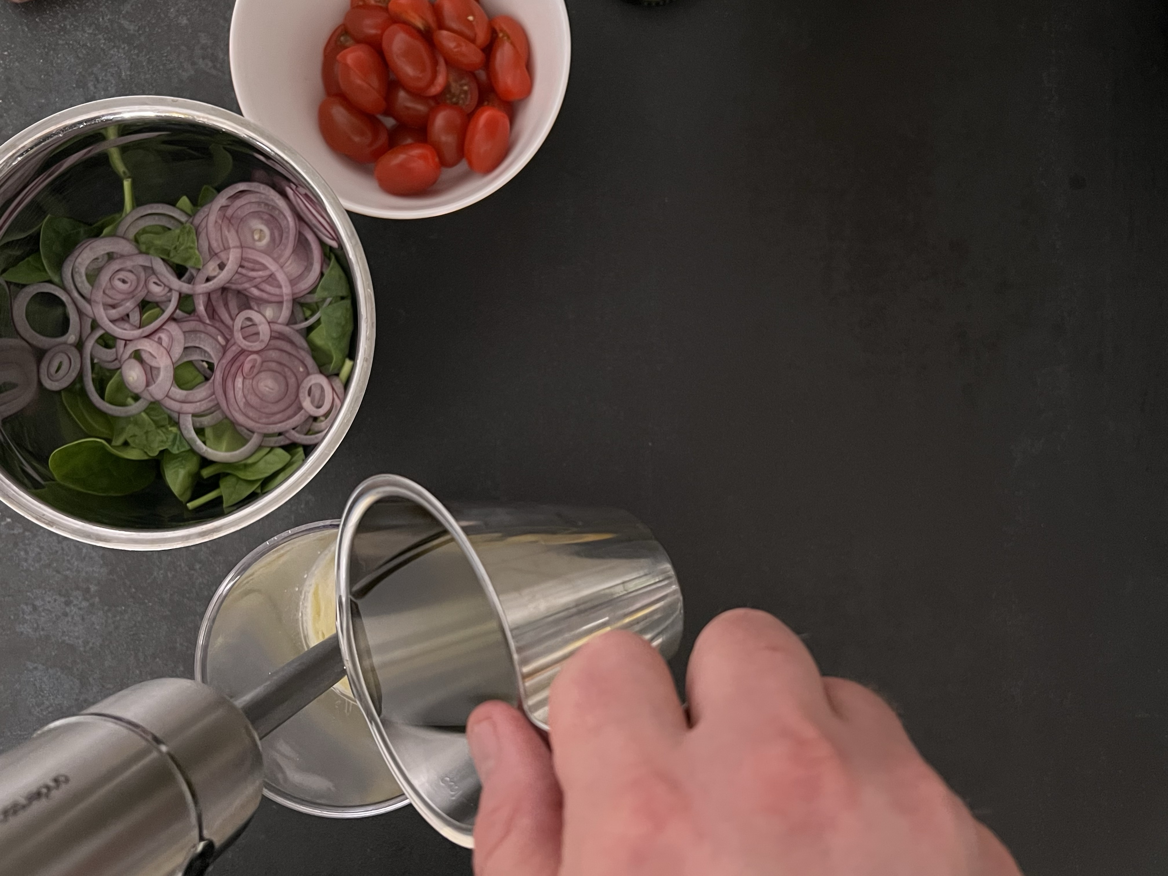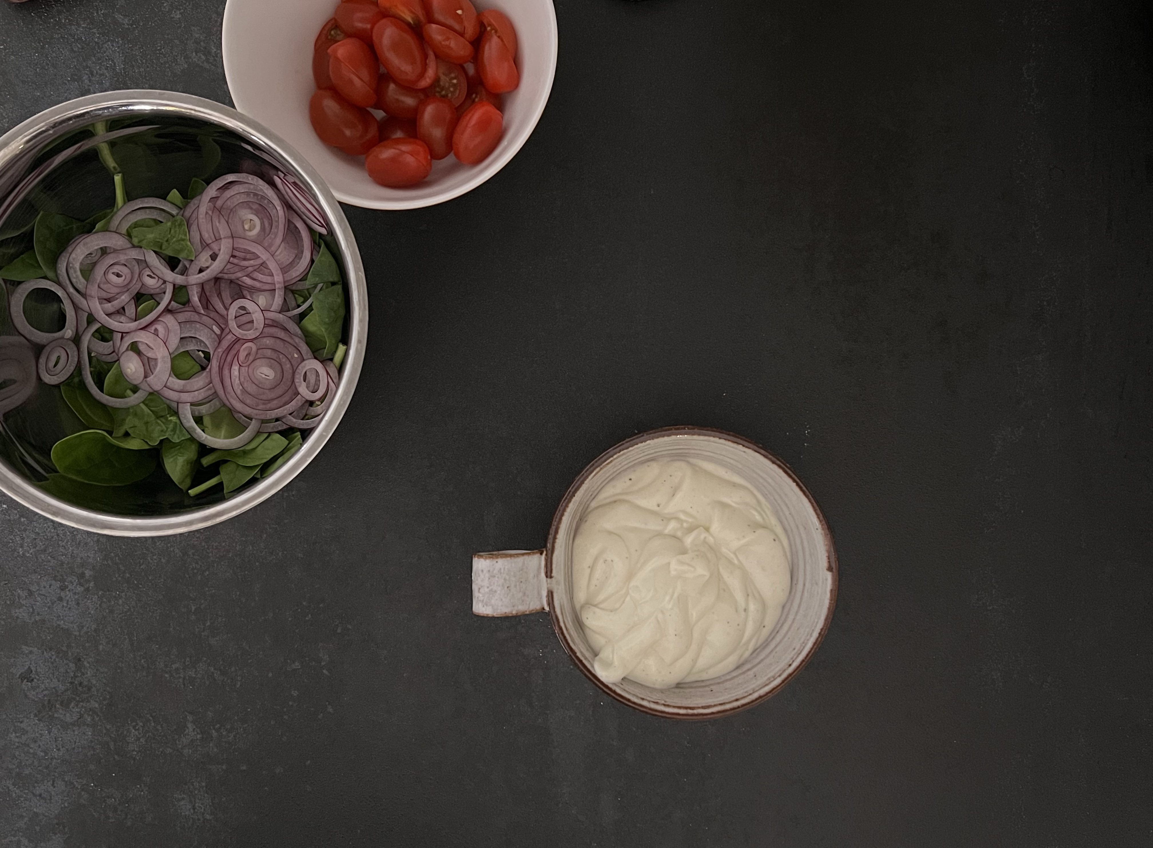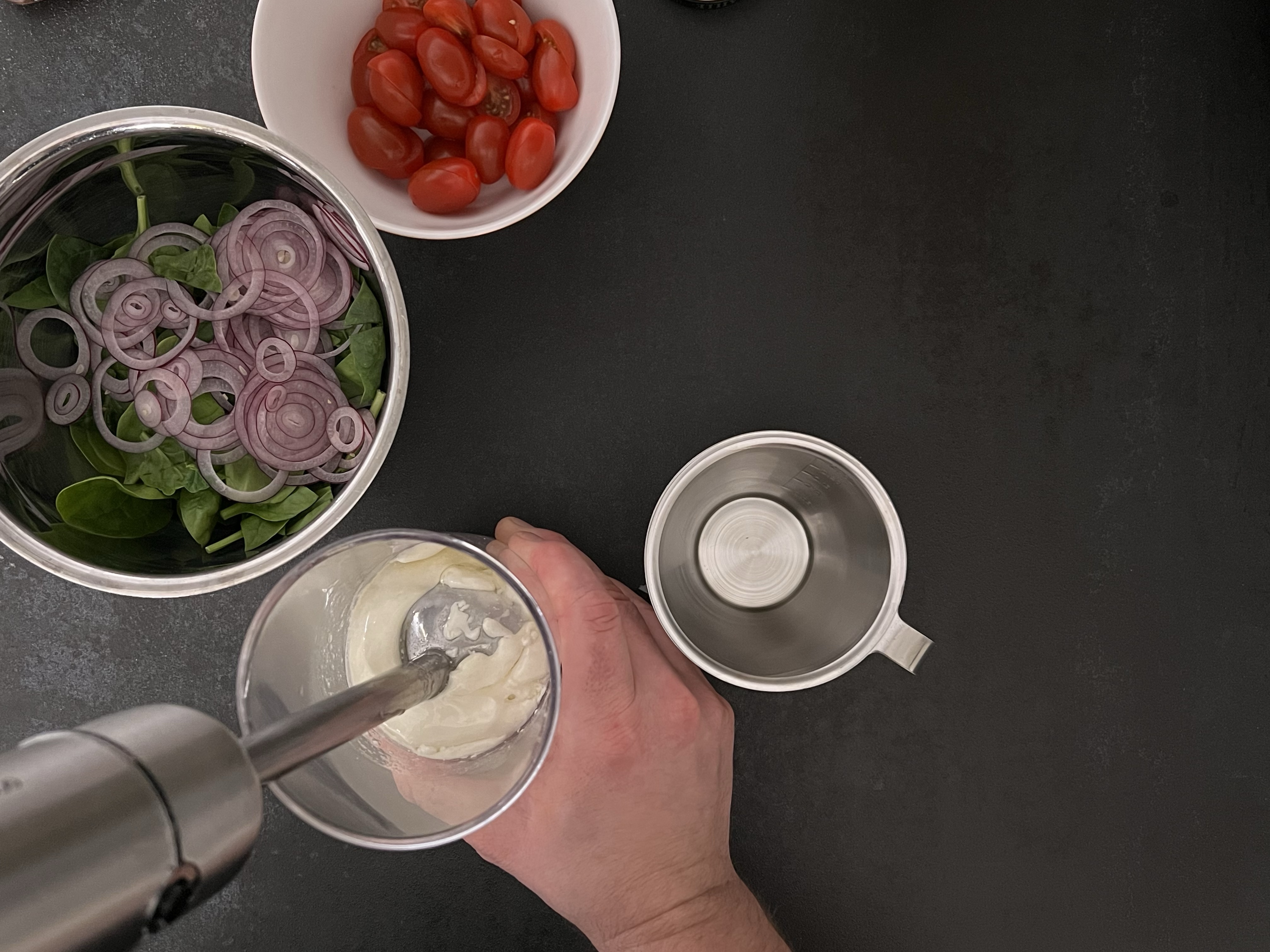 Aquafaba, citron, dijonsenap, rapsolja och kryddor. Mixas med en mixerstav och är klart på nolltid.