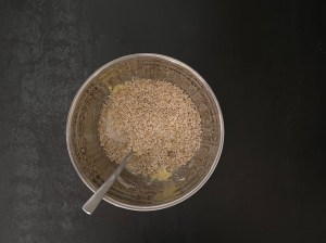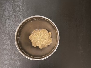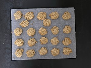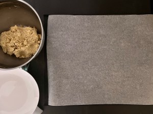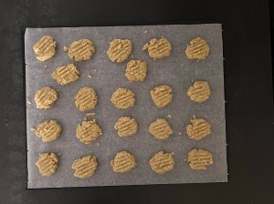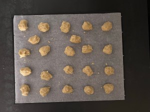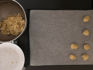 Den här kakan blandas med gaffel och sen knådas den för hand, vägs upp, rullas i bollar och pressas med gaffel innan de åker in i ugnen.