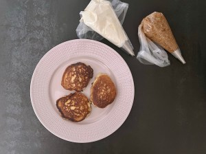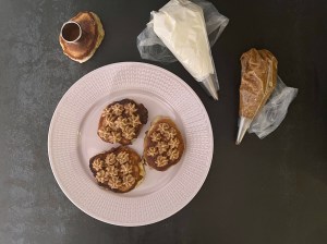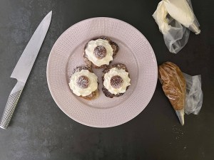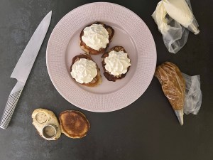 Sen lät jag krabbelurerna svalna lite innan jag spritsade små toppar mandelmassa på dem och en större spritsklick grädde ovanpå. Delade en krabbelurer på mitten och stansade ut små cirklar som lock till ”semlan”. Så den ser lite mer autentisk ut.