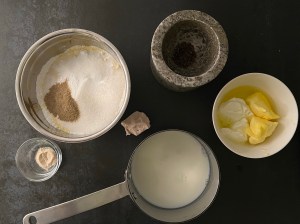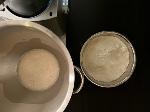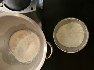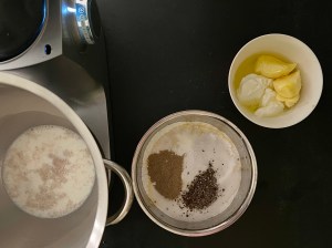 När mjölet är inarbetat, stanna maskinen och tillsätt restan av mjölet samt smör, kesella och äggvita, blanda samman på låg fart och höj sedan farten till medel på maskinen och kör i 3-4min. Man ska se på degen att de små ”droppformade” klumparna som blir som ojämnheter i början, arbetas in och degen blir jämn