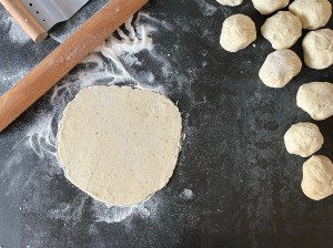 Kavla ut en bit i taget till en rund platta på ca 20cm i diameter. Mjöla under och lyft försiktigt upp degen medans du kavlar, så att den inte fastnar