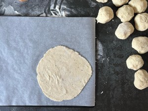 Återupprepa från steg 4. När plåten är varm så kavlar jag och lägger plattorna på ett bakplåtspapper bredvid plåten och för över pappret när båda plattorna är färdiga. Så att den första inte börjar bakas av den varma plåten.