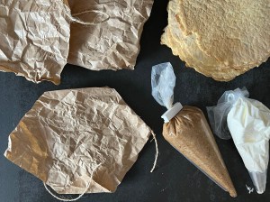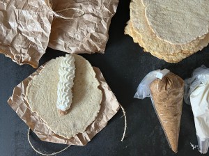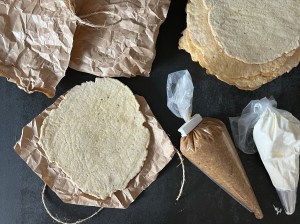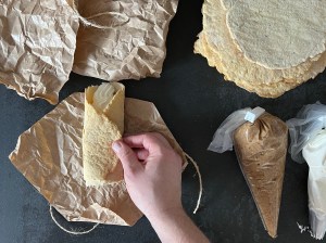 Först gjorde jag min deg och lät den jäsa i ca 30min, medans degen jäste rostade jag nötterna. Efter det vägde jag upp degen i 12 lika stora bitar som jag sen kavlade ut och gräddade 2 i taget. Det viktiga är att kavla riktigt tunt, 1-2mm och var noga med att mjöla, så att de inte fastnar i bänken. Det blir en del mjöl, men efter att de svalnat så tog jag en torr och mjuk pensel och borsta bort det mesta av det lösa mjölet. Medan jag låter bröden svalna så mixar jag mandelmassan och vispar grädden, och så förbereder jag pappar och snören. Det går bra att använda vanligt bakplåtspapper, knöla ihop det först bara, så blir det lättare att hantera.