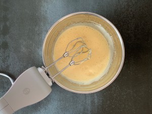 Sikta i mjölblandningen i äggmixen och vispa slätt på låg hastighet