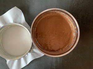 Lägg en bakplåtspapper på toppen och en plåt på pappret, vänd upp och ner och låt den svalna upp och ner i formen