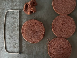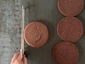 Dela den i 4 jämna skivor, ca 1,5cm per skiva. Använd gärna en tårtsåg. Det översta tunna och ojämna lagret spar du för att smula till dekoreringen.