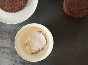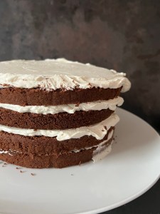 Jag tog ett beprövat recept på botten och använde min chokladbotten från den här tårtan en makalöst god tårta, om man tycker om choklad. Bakade botten i en springform på 18cm som jag klädde med bakplåtspapper både i botten och på insidan, jag upplever att den lyfter och blir lite högre då. Sen skar jag 4 lika tjocka bottnar och toppresterna smulade jag till garnering.