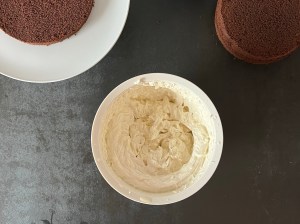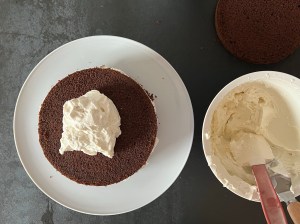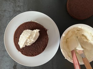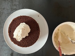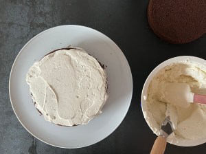 Lägg en skiva på botten av ett tårtfat och lägg en klick frosting på, bred ut till ett jämnt lager fyllning