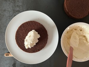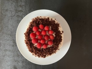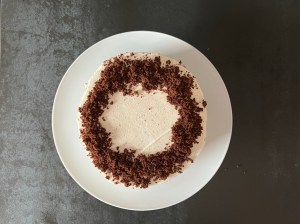 Ta ut tårtan ur kylen och dekorera runt om kanten med smulorna