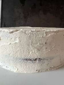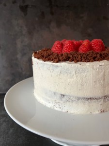 Tårtan byggde jag i jämna lager. Botten, frosting, botten, frosting osv. Efter det spacklade jag tårtan med frostingen, jag ville ha den lite ruff, tycker att det kan bli rätt snyggt så. Dekorerade senmed en cirkel smulor på toppen och fyllde cirkeln med färska hallon.