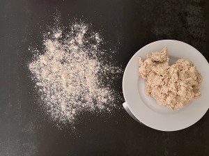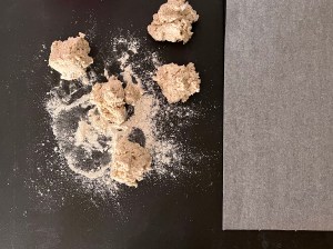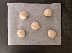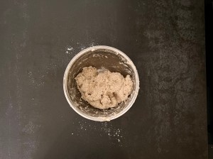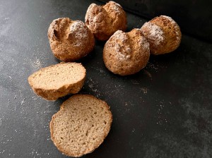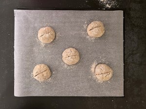 Först startar jag ugnen och sätter på snabbvärmningen, eftersom bröden inte ska jäsa. Sen blandar jag alla torra ingredienser i en skål och därefter blandar jag filmjölk och äppelmos. Försök att använda en så ren och bra äpplemos som möjligt, för smak och innehåll. Jag använder Urtekrams ekologiska. Efter det blandar jag i de torra ingredienserna och blandar väl med en träslev. Tar upp degen på mjölad bänk, använder havremjöl i detta steget. Sen rullar jag fem lika stora bollar, lägger dem på bakplåtspappersklädd plåt och strör över lite havremjöl. Skär sen en skåra, ca 1cm djup rakt över alla bröd och bakar av dem. Innan jag skär i dem så låter jag dem svalna på ett galler.
