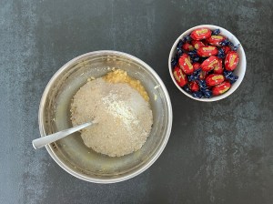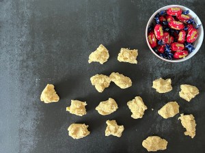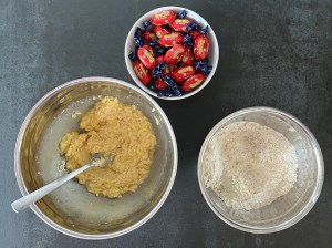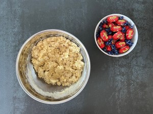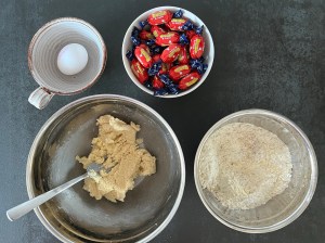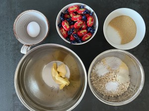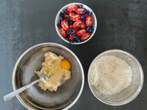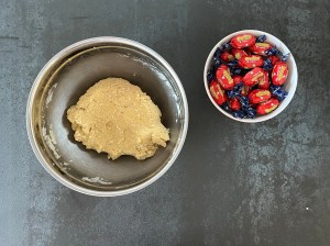 Jag börjar med att starta ugnen. Sen blandar jag smör och socker med en gaffel, tillsätter ägget och blandar samman. Efter det blandar jag alla torra ingredienser och tillsätter i smöret och blandar med gaffeln till en klumpig massa. Efter det knådar jag samman degen för hand.