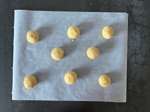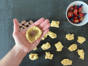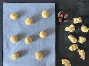 Väger upp degen i lika stora bitar, arbetar ut dem till en platta i handflatan och lägger en dumle mitt i plattan och omsluter den med degen. Lägger dem på två bakplåtspappersklädda plåtar och bakar av en i taget. När de kommer ut ugnen får de svalna immande flyttas, så att kolan sätter sig.