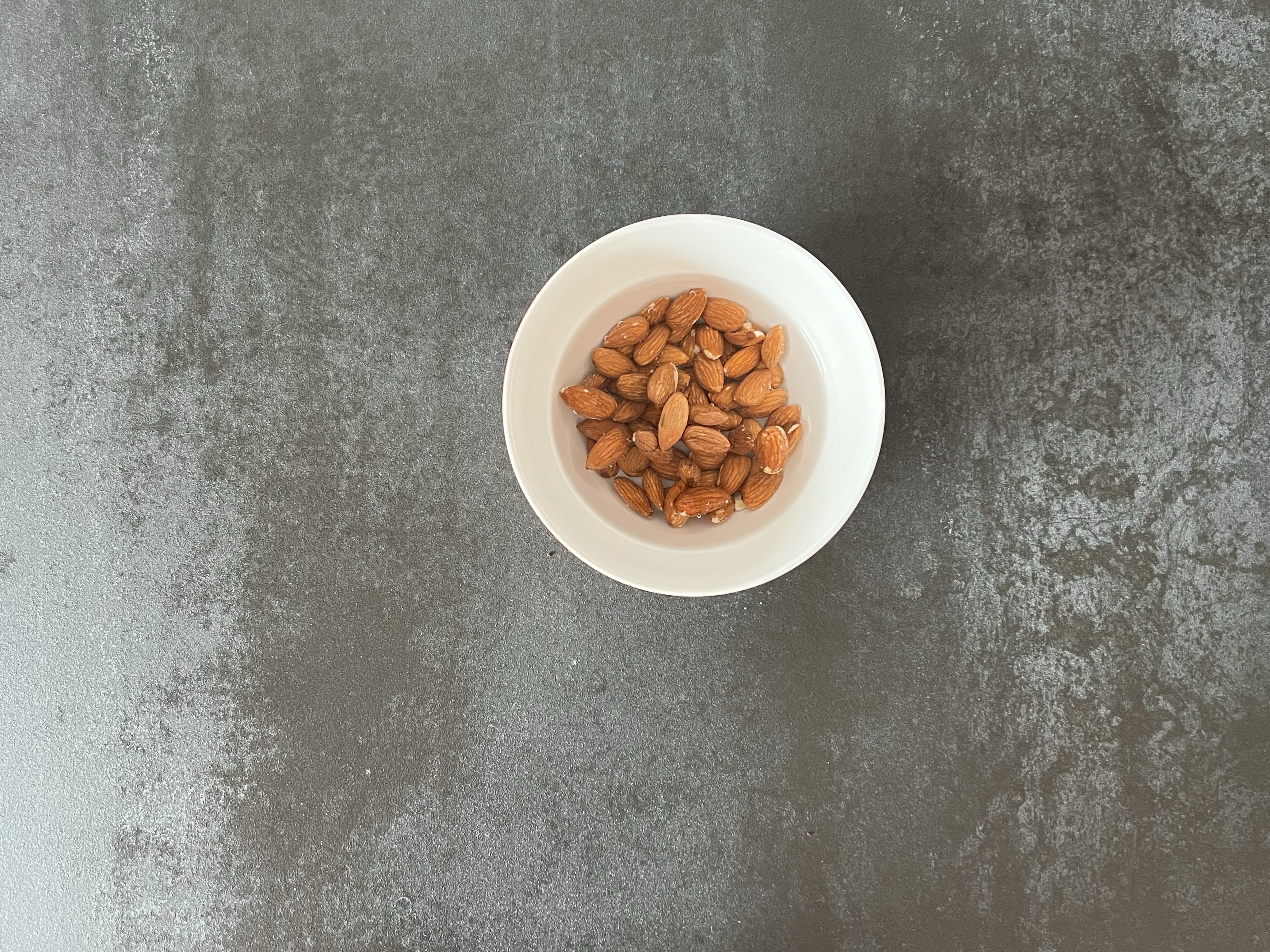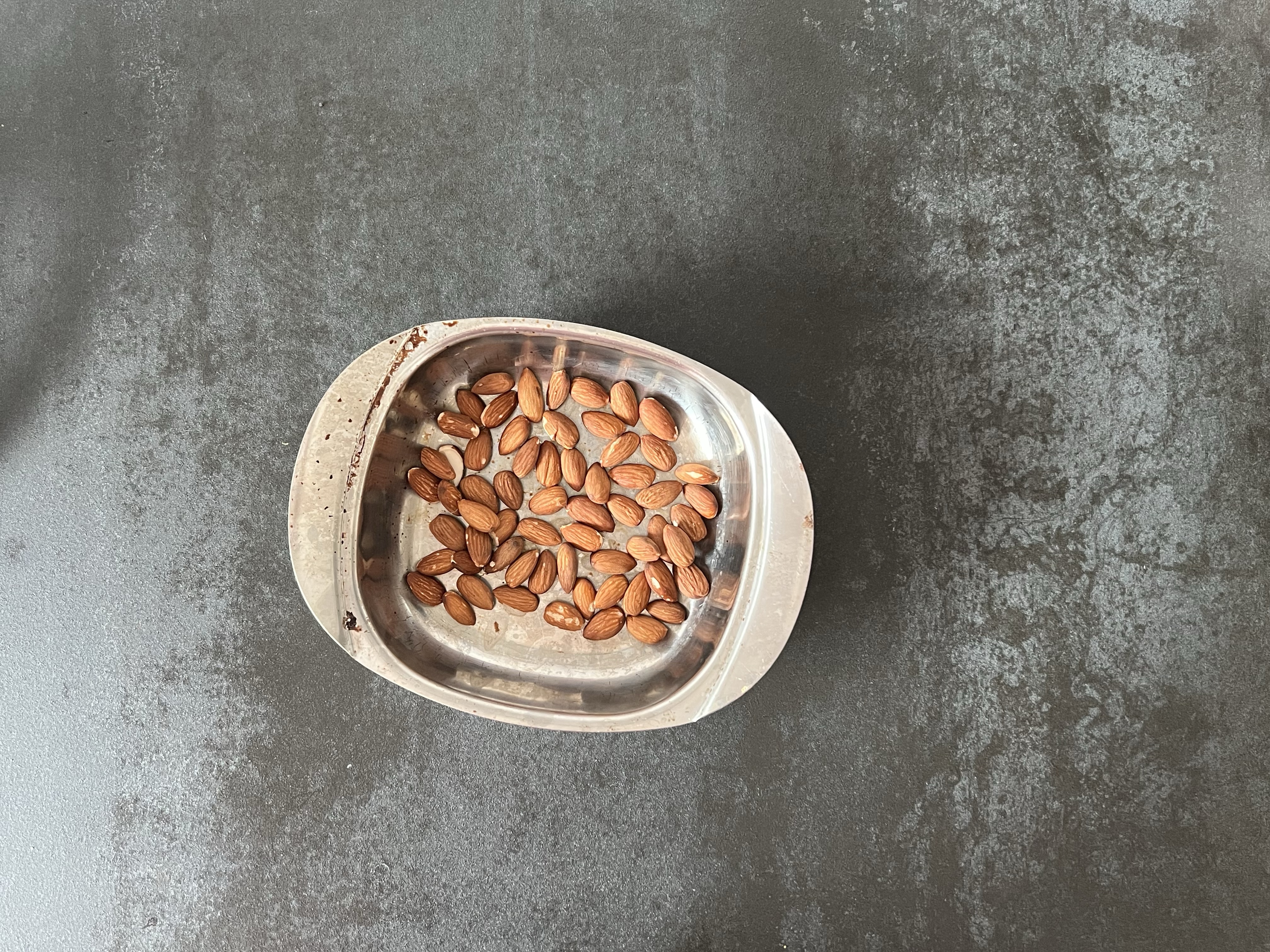 Först startar jag ugnen på 175°c varmluft och lägger mandeln i blöt i 10min. När ugnen är varm rostar jag mandeln i 10min och låter den sen svalna.