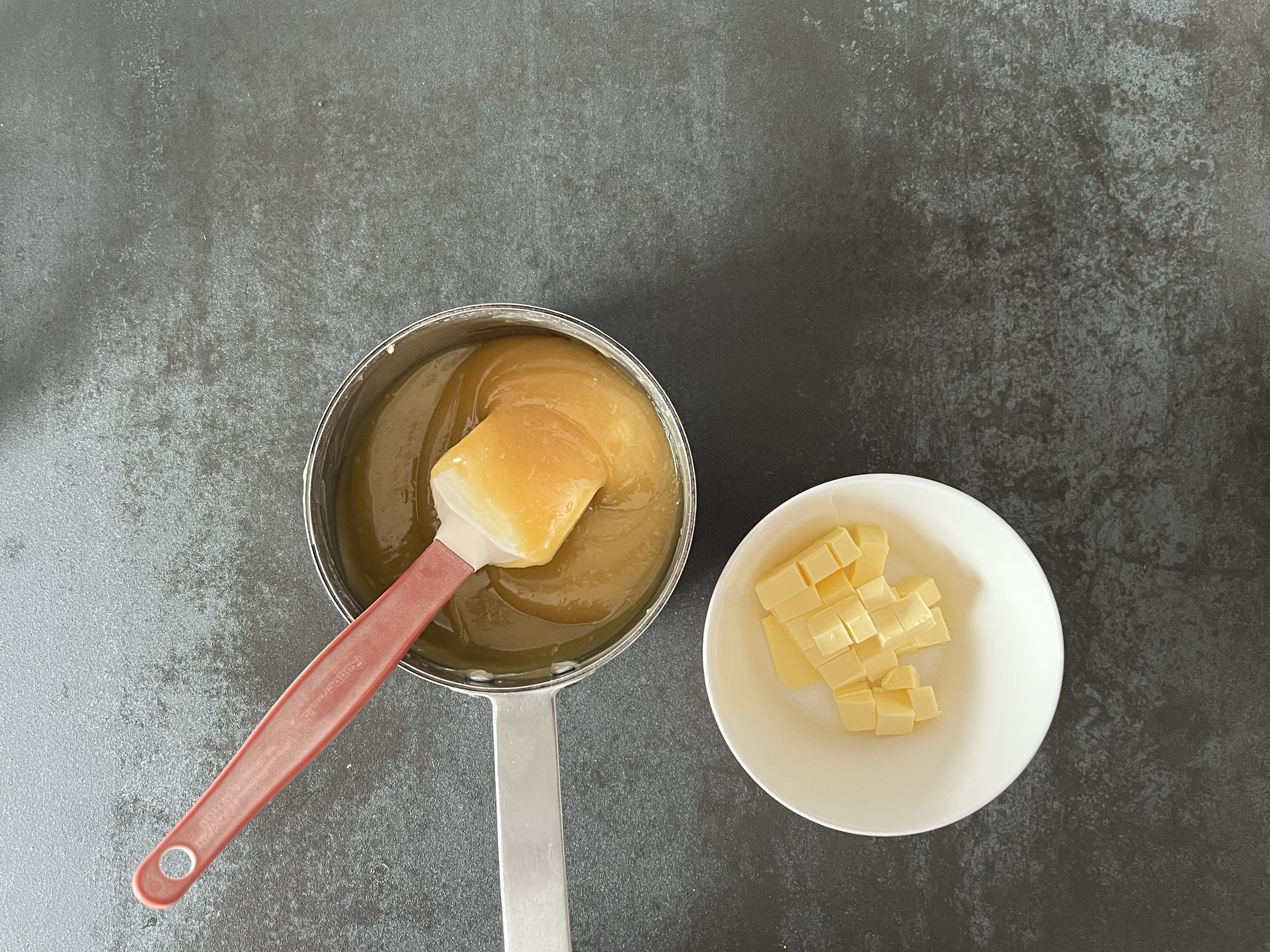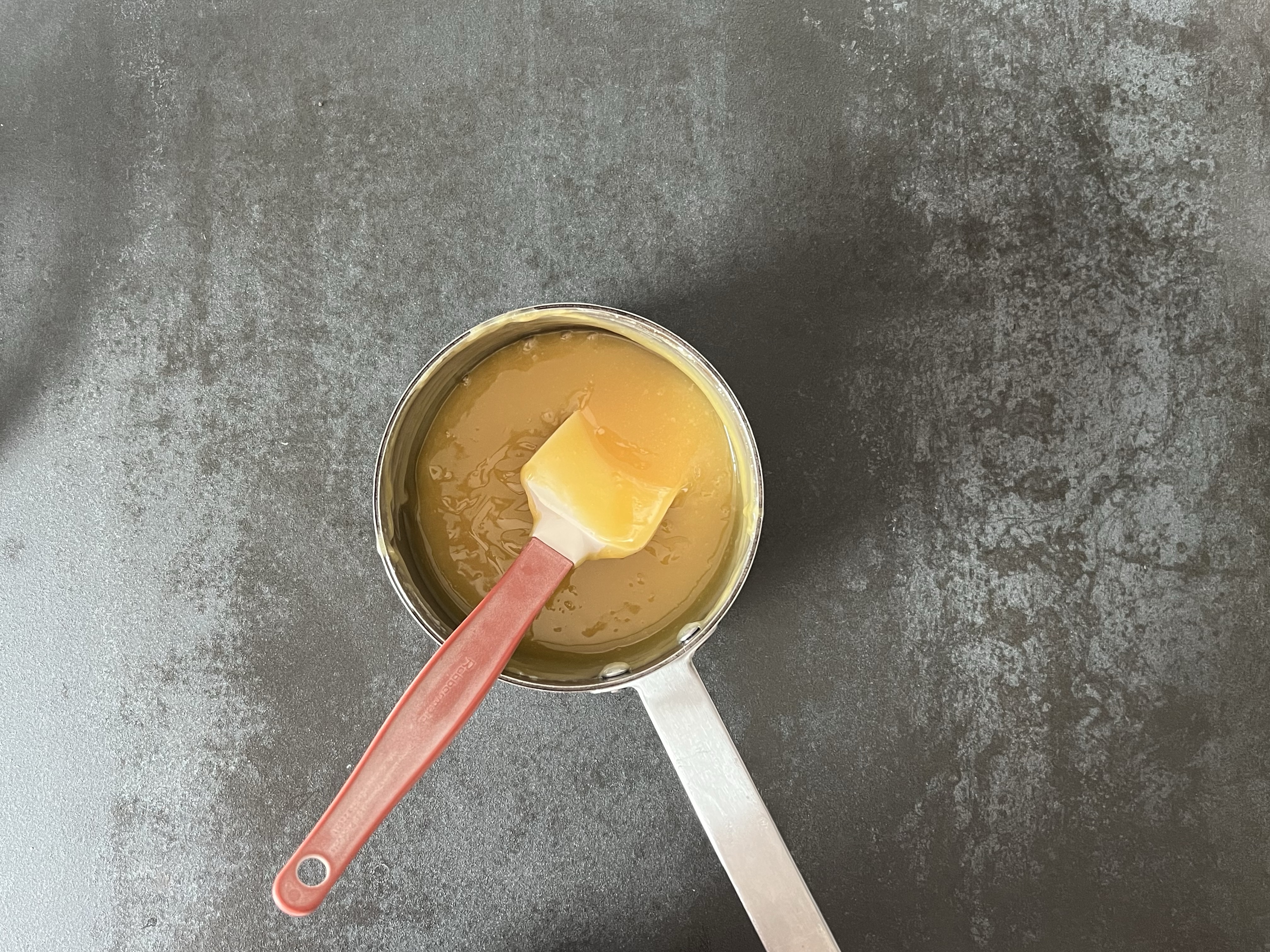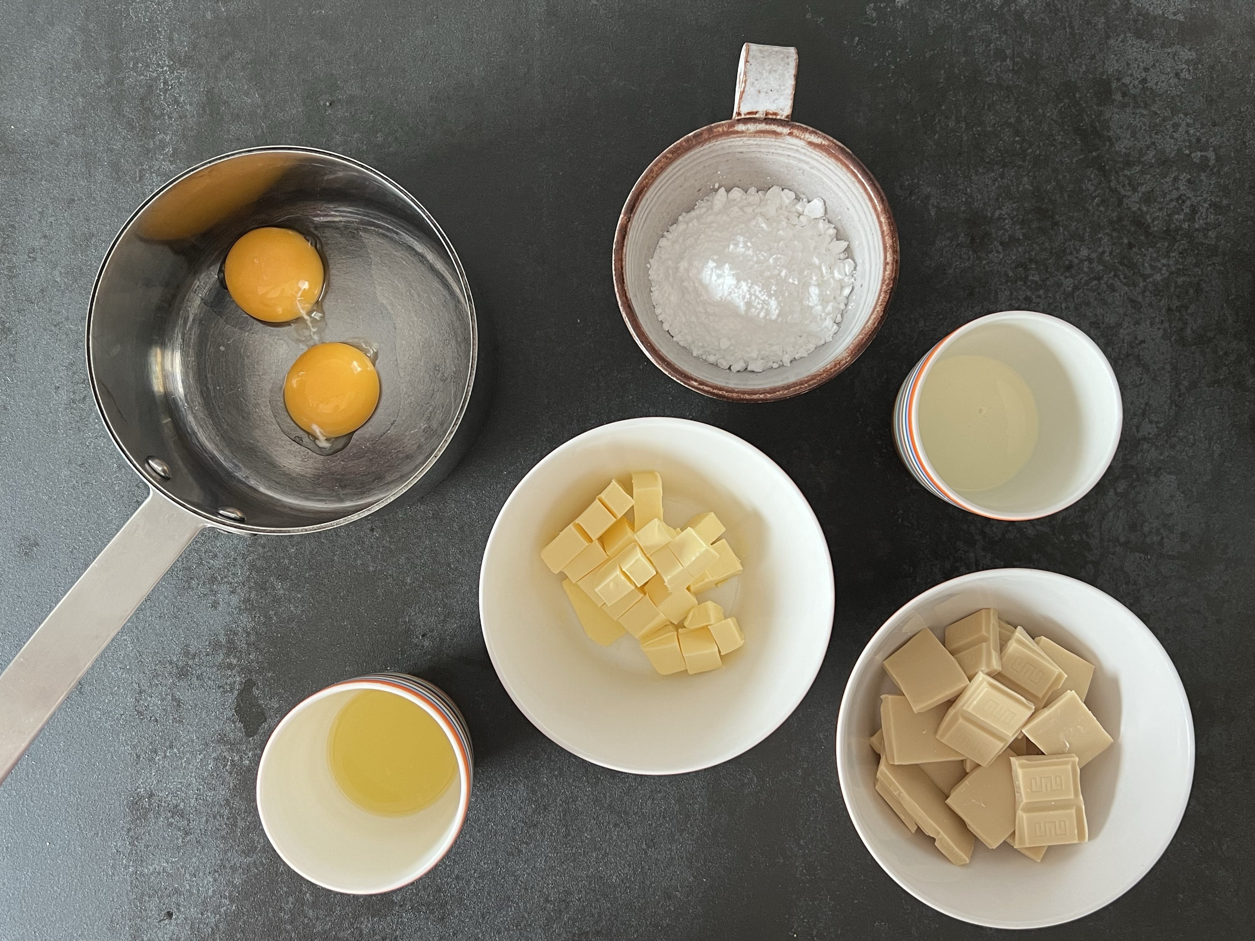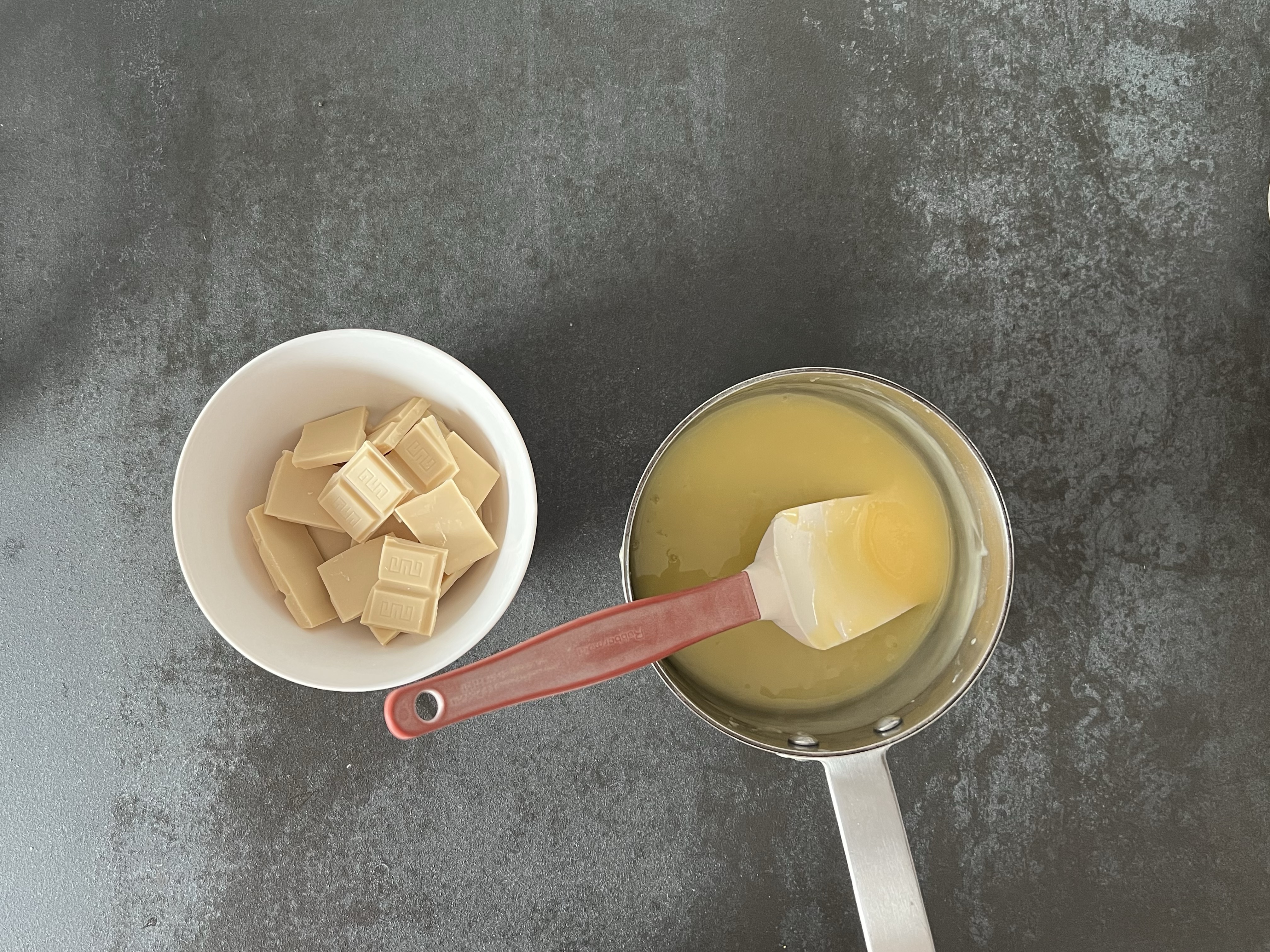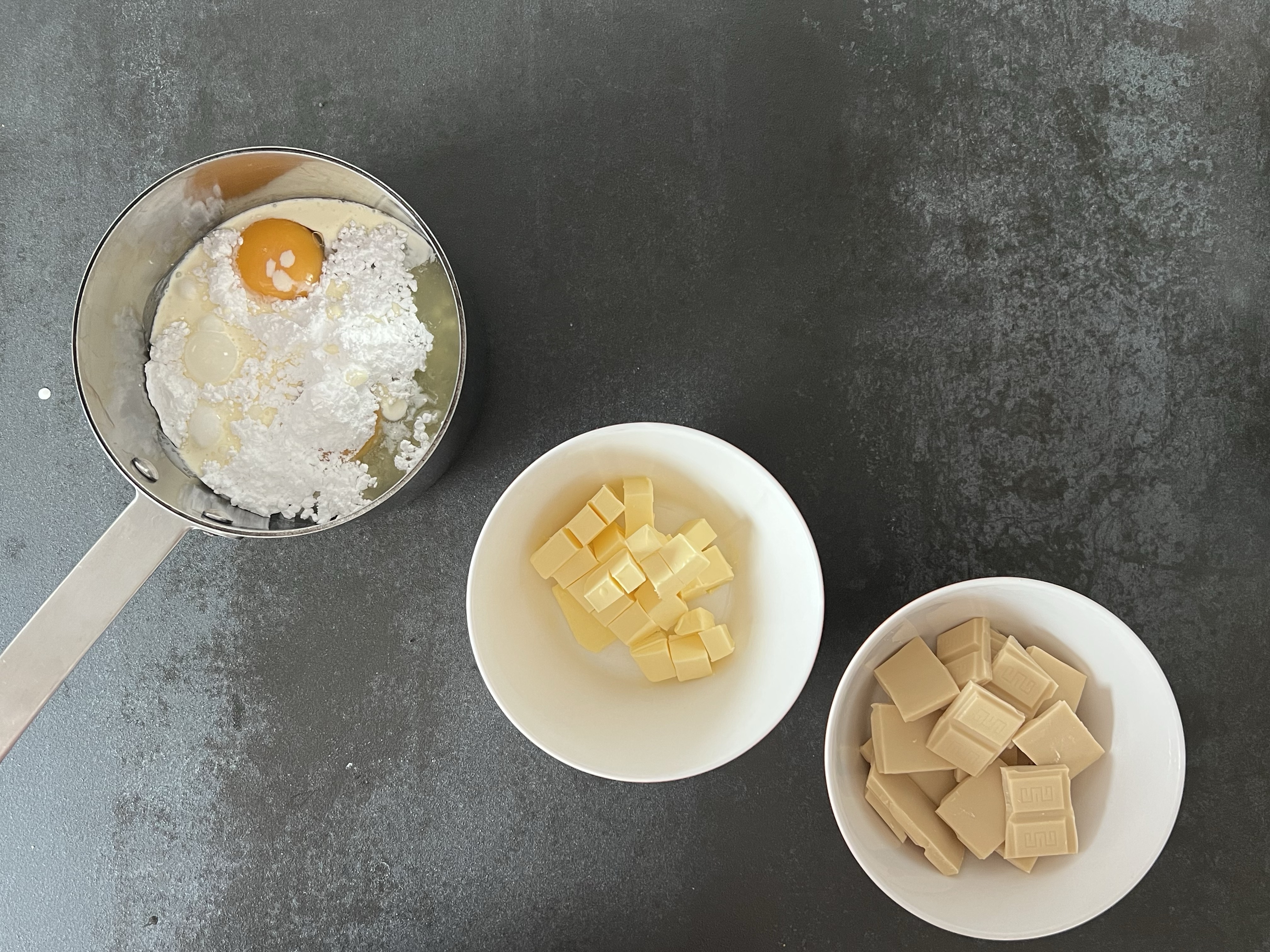 Samtidigt gör jag krämen. Blandar äggula med florsocker, vispgrädde och citronsaft. Värmer under omrörning tills det tjocknar. Sen smälter jag ner chokladen i äggsmeten och sist smöret. Häller över krämen i en ren skål och kyler den.