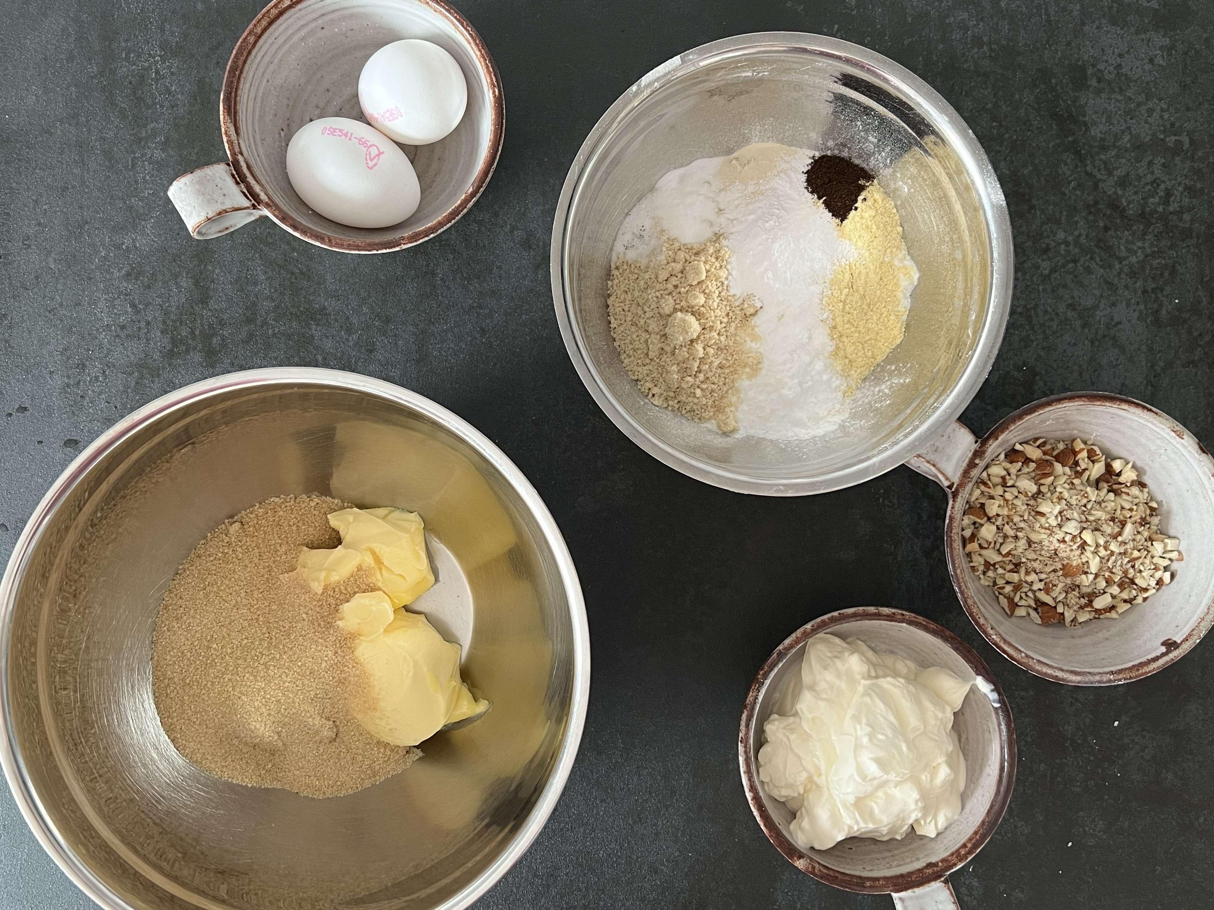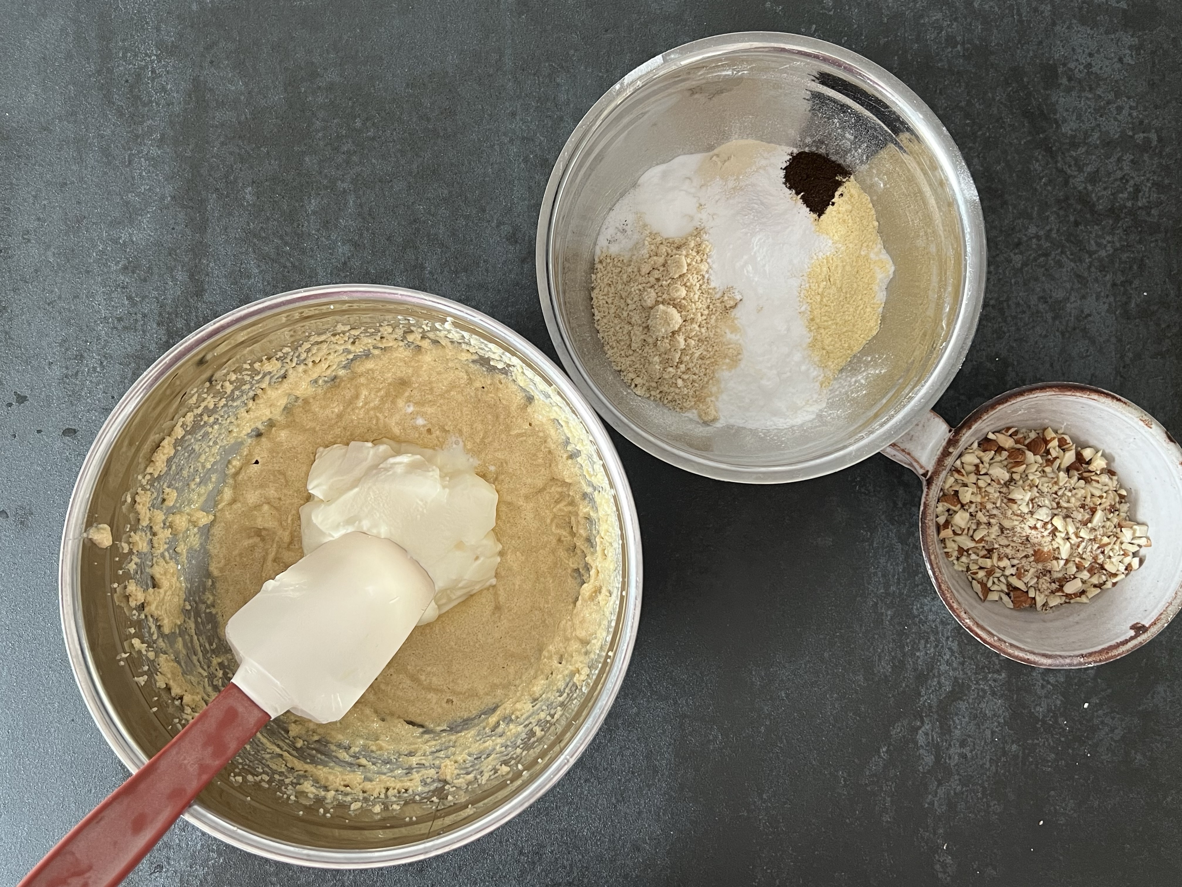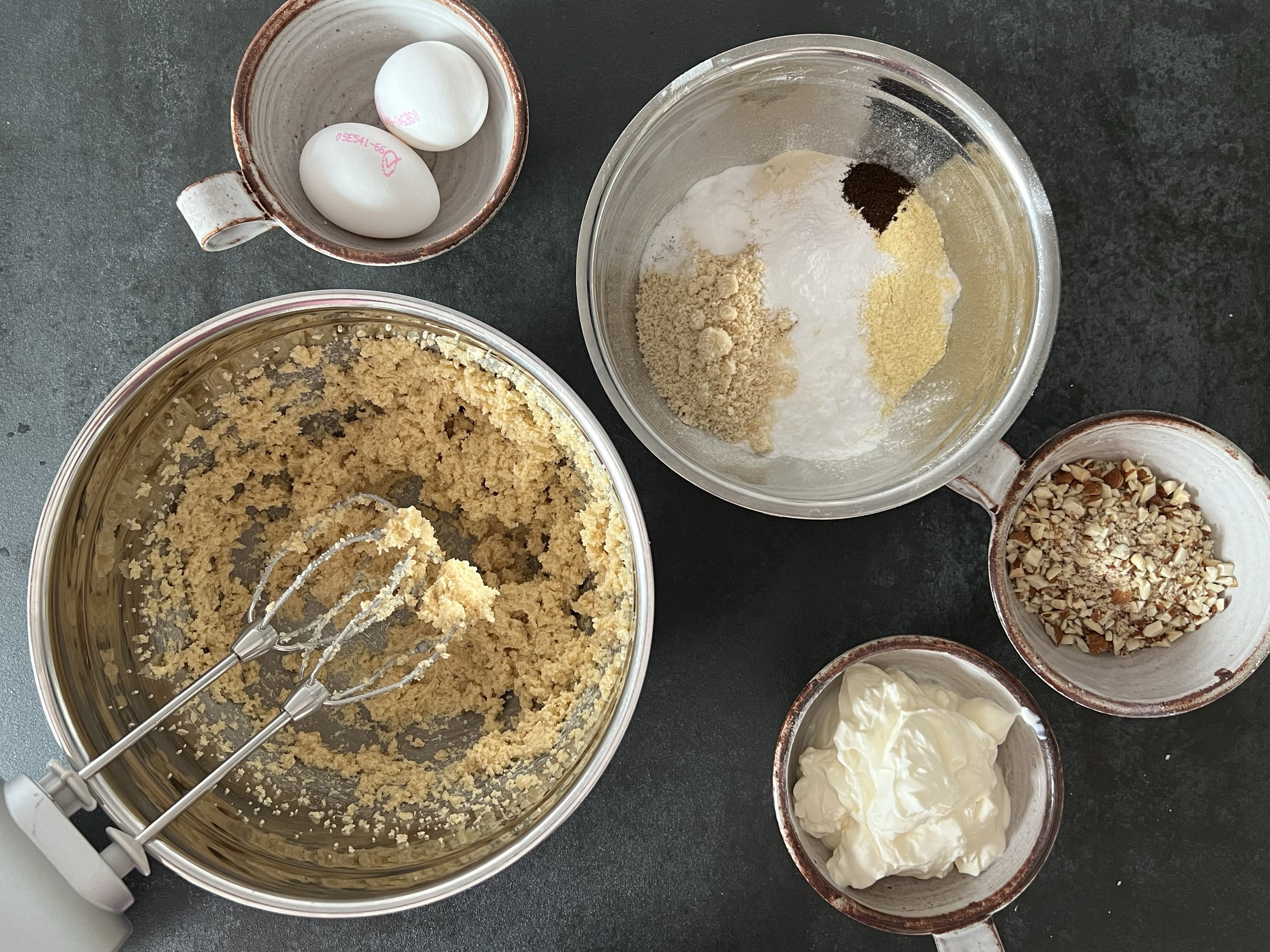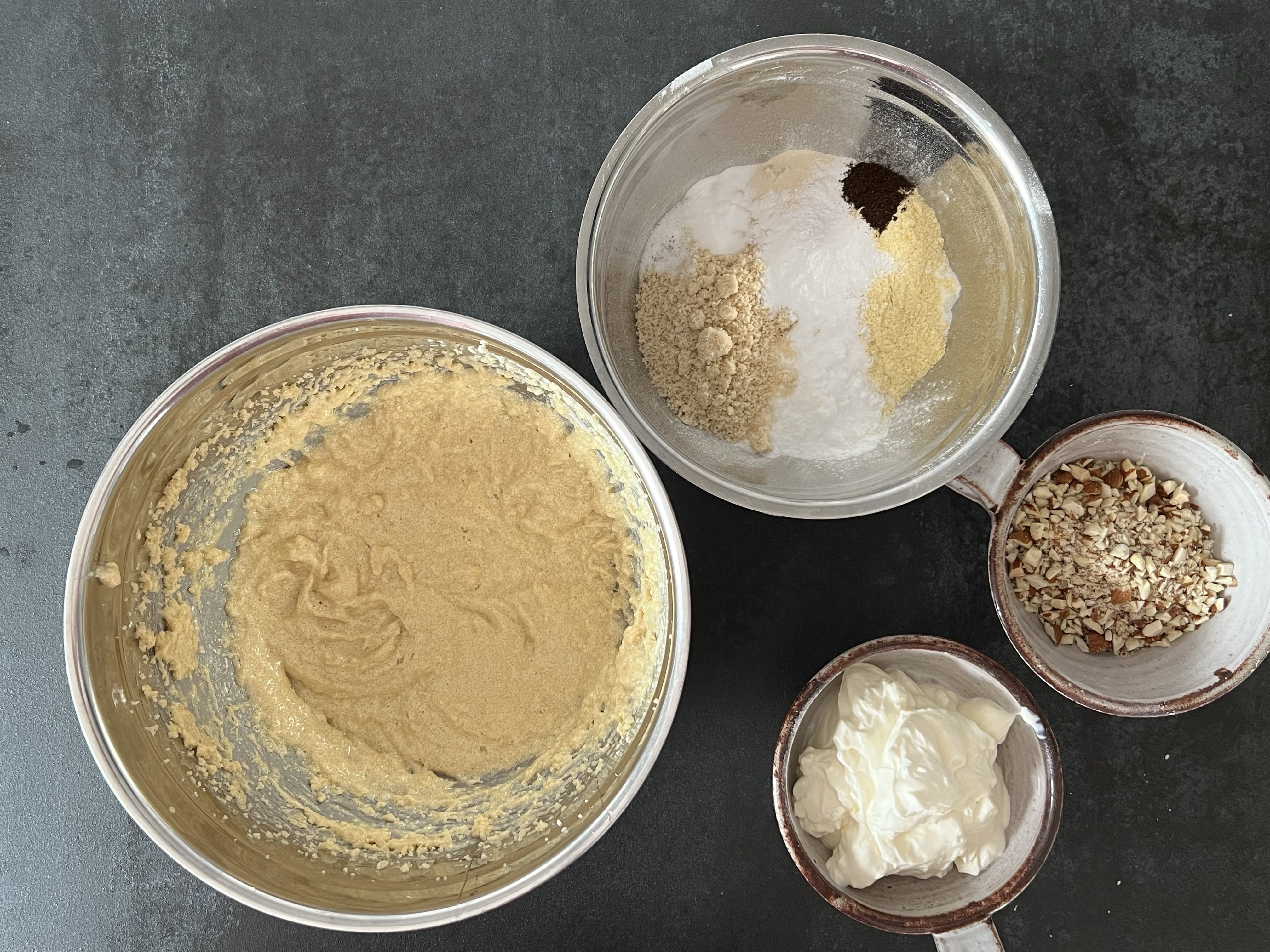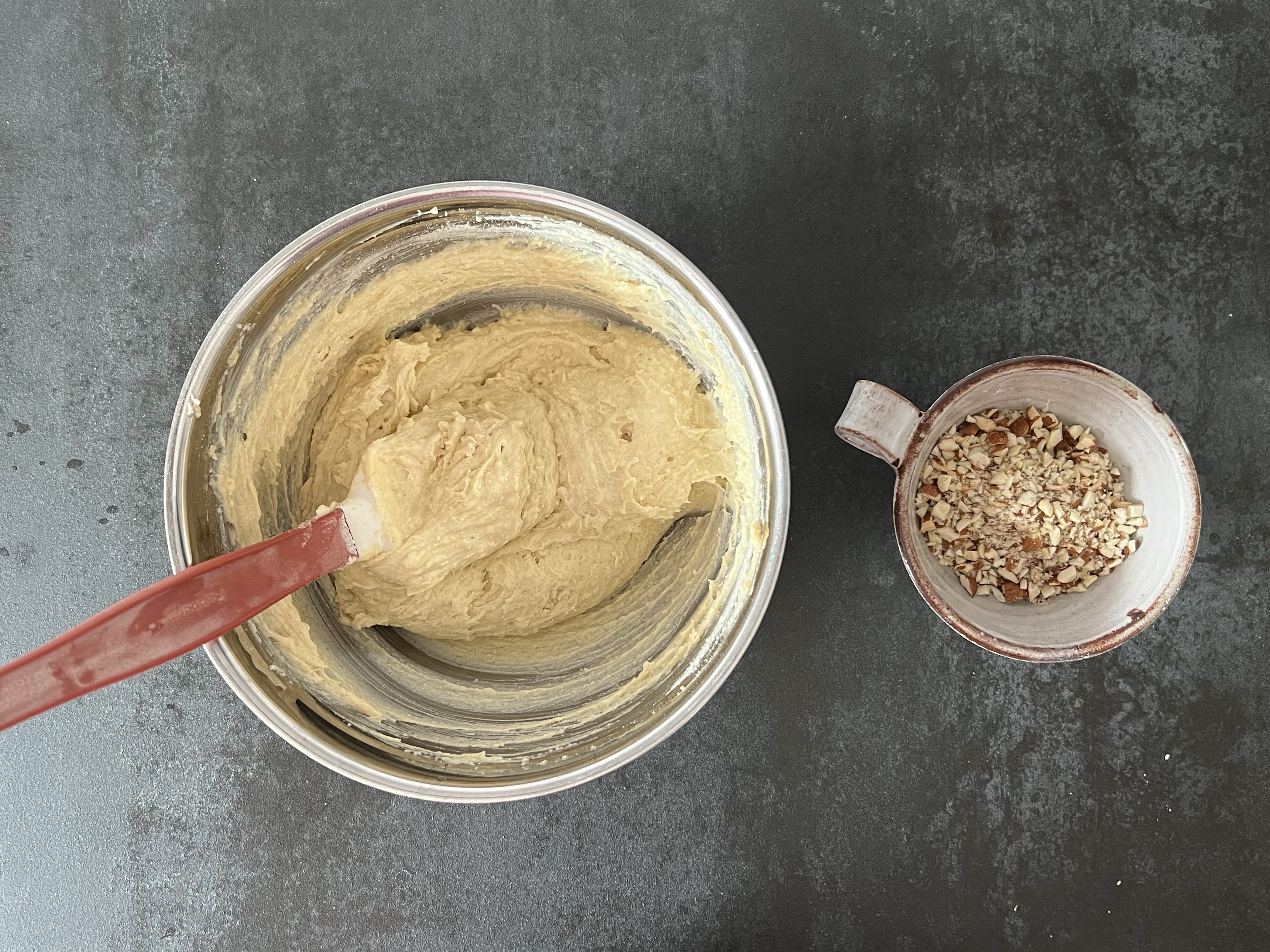 När krämen står i kylen börjar jag med kakan. Jag börjar med att väga upp smör och socker i en skål. Sen grovhackar jag mandeln. Bladar alla övriga torra ingredienser i en skål och ställer åt sidan. Vispar sen smöret med sockret, så att det blir fluffigt. Sen tillsätter jag äggen och vispar samman. Efter det vänder jag ner créme fraîche, sen fortsätter jag att vända ner mjölmixen med en slickepott och sist vänder jag ner den hackade mandeln. Efter det för jag över smeten i en springform med storlek 23-25cm. I botten på formen klämmer jag ett bakplåtspapper och kanterna smörjer jag med smör. Efter det bakar jag av kakan och när den är klar får den svalna helt innan den är redo för krämen.