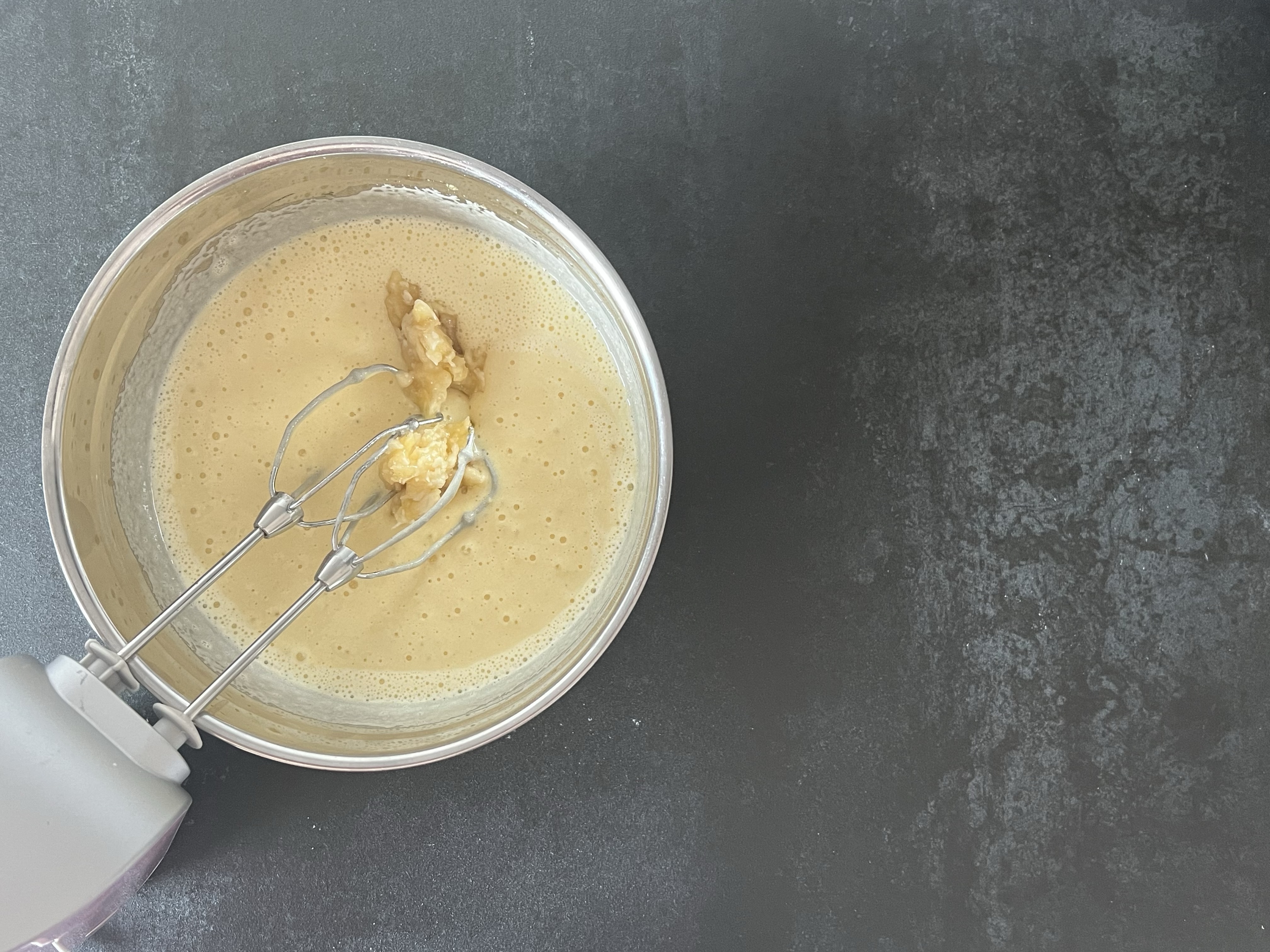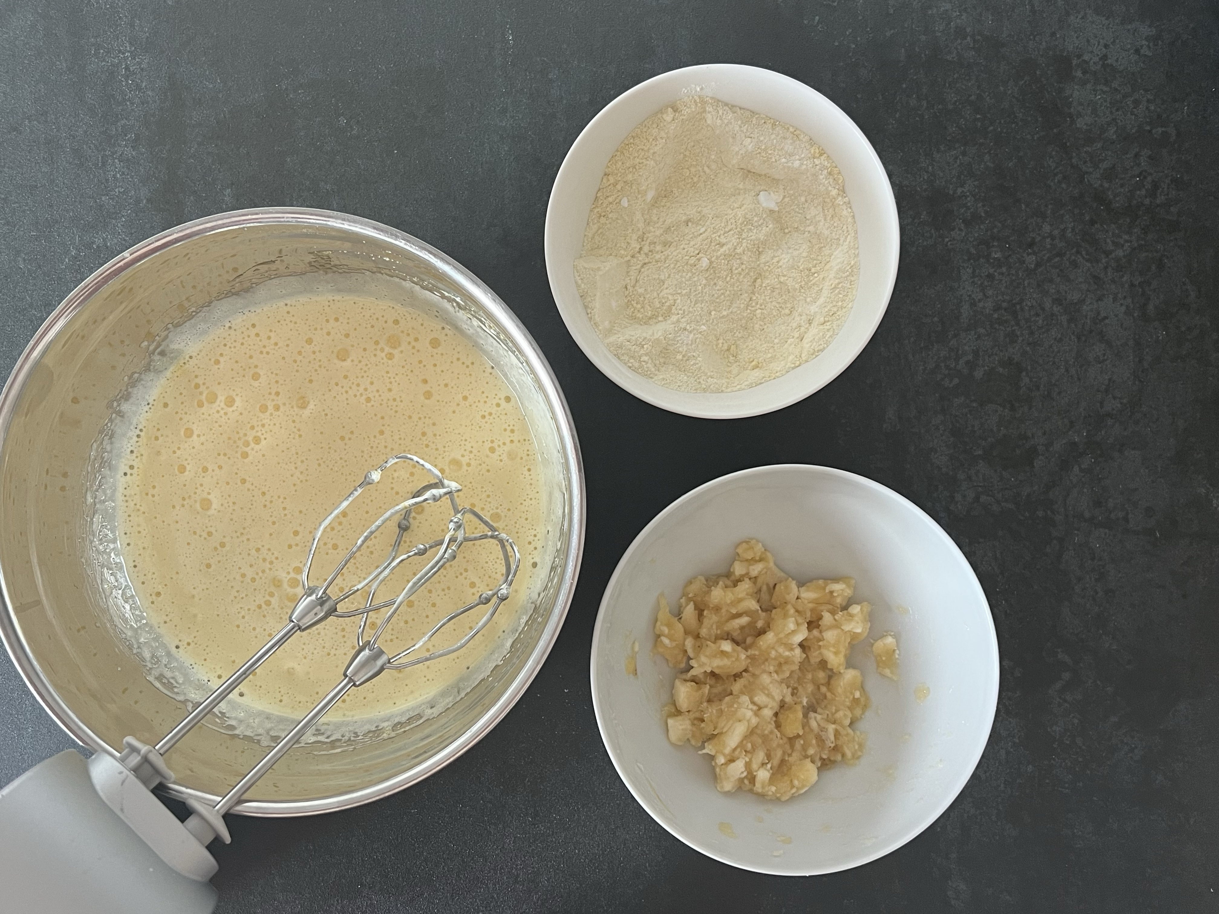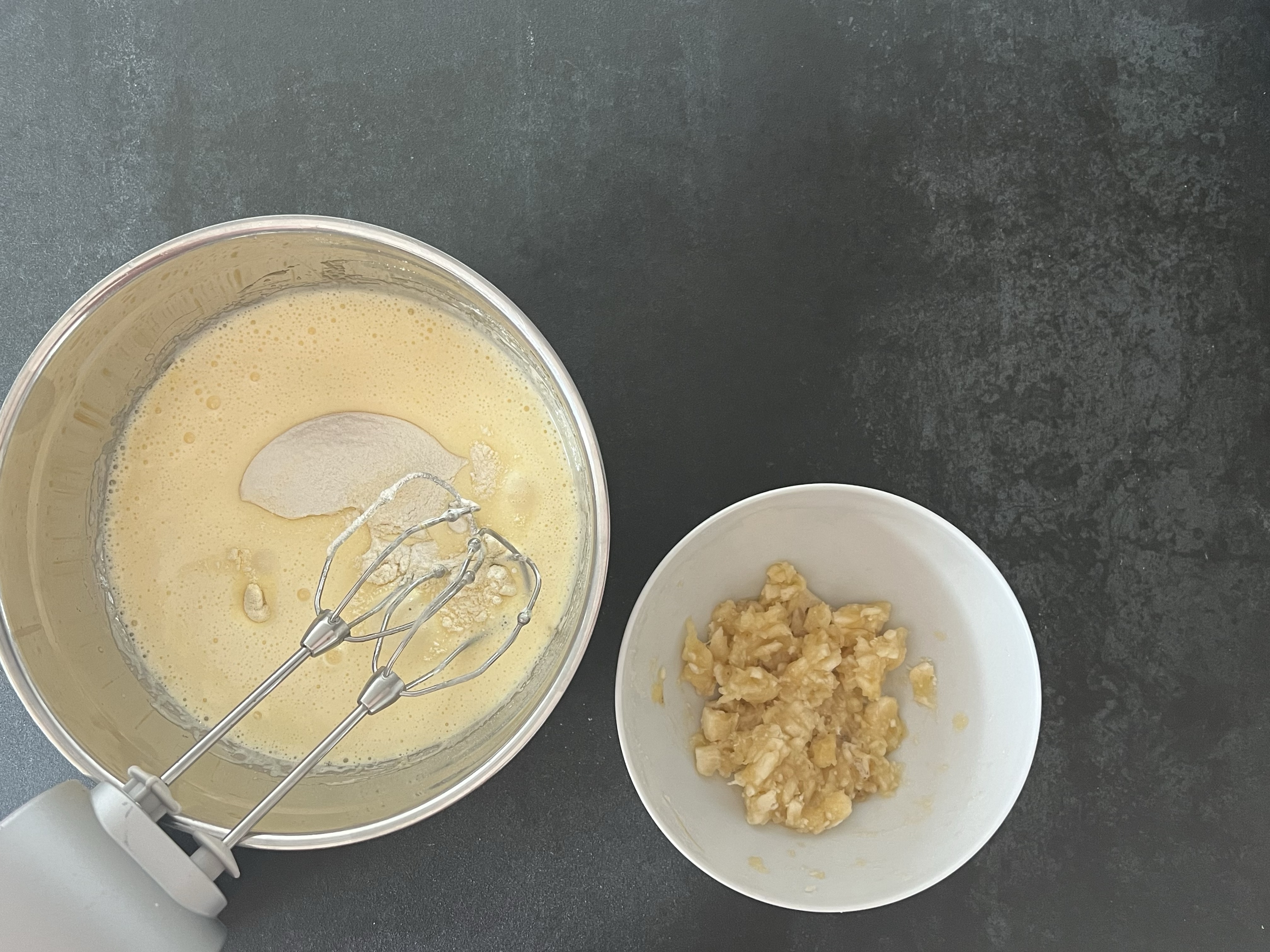 Jag börjar med muffinsen. Blandar alla torra ingredienser till en mix. Smälter smöret och tillsätter mjölken, och sen mosar jag bananen. Efter det vispar jag ägg och socker vitt och pösigt. Tillsätter smörmjölken och vispar samman på låg hastighet. Därefter tillsätter jag mjölmixen och vispar slätt på låg hastighet innan jag gör detsamma med den mosade bananen.