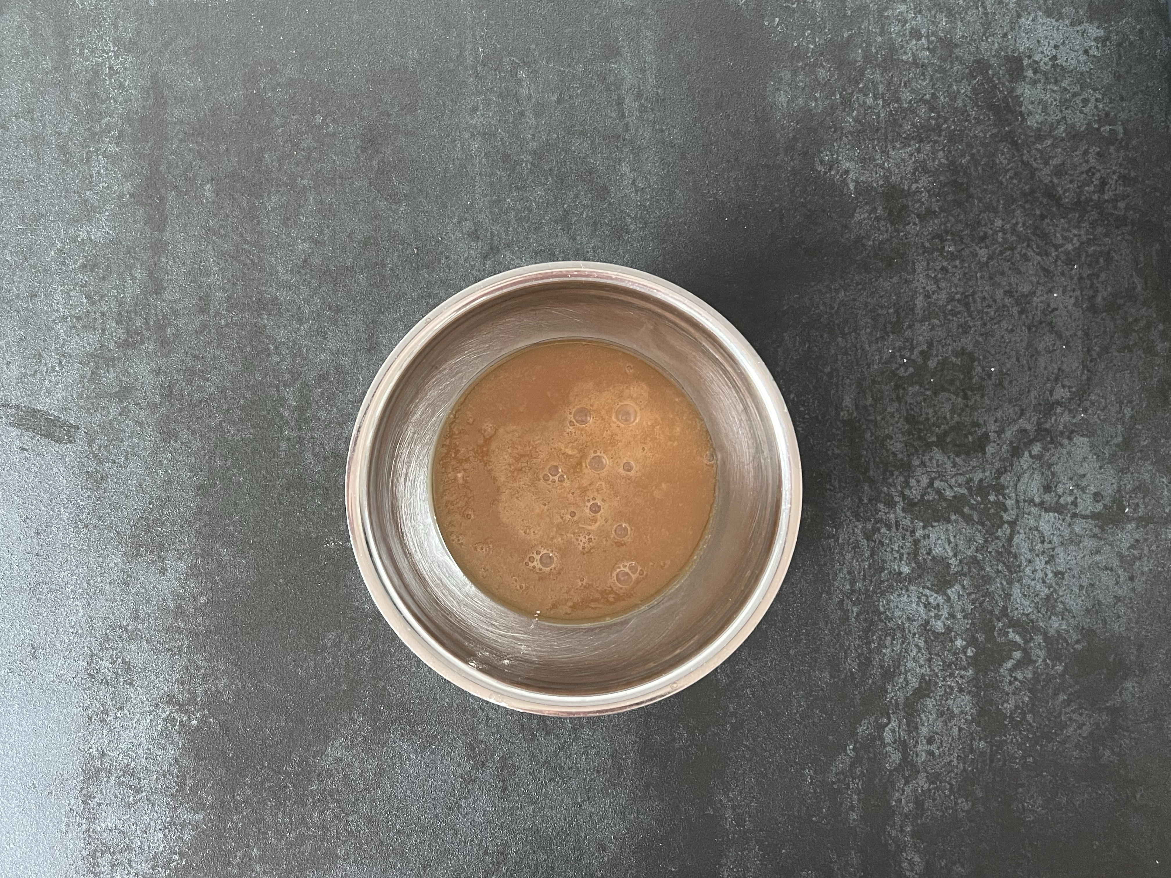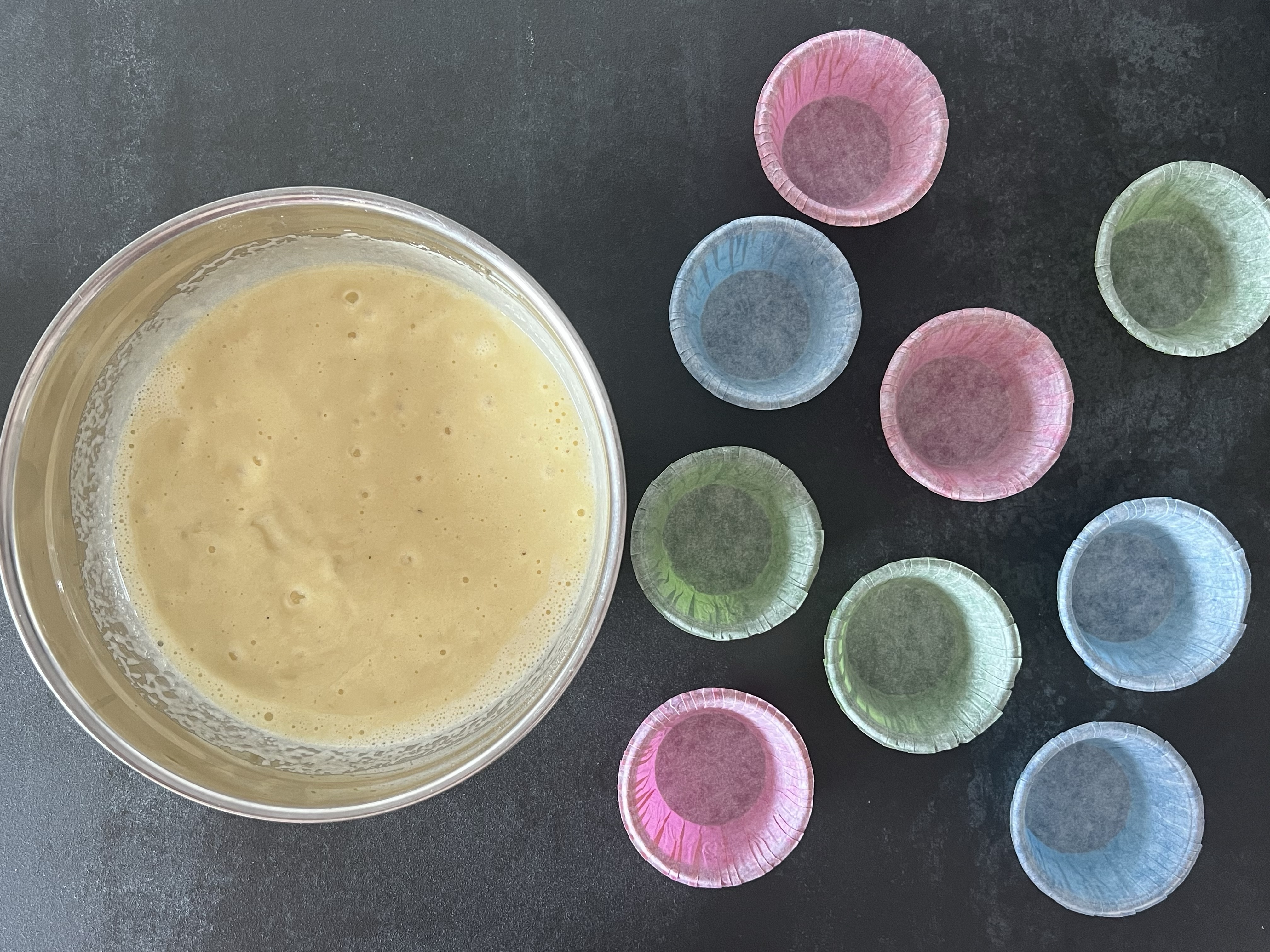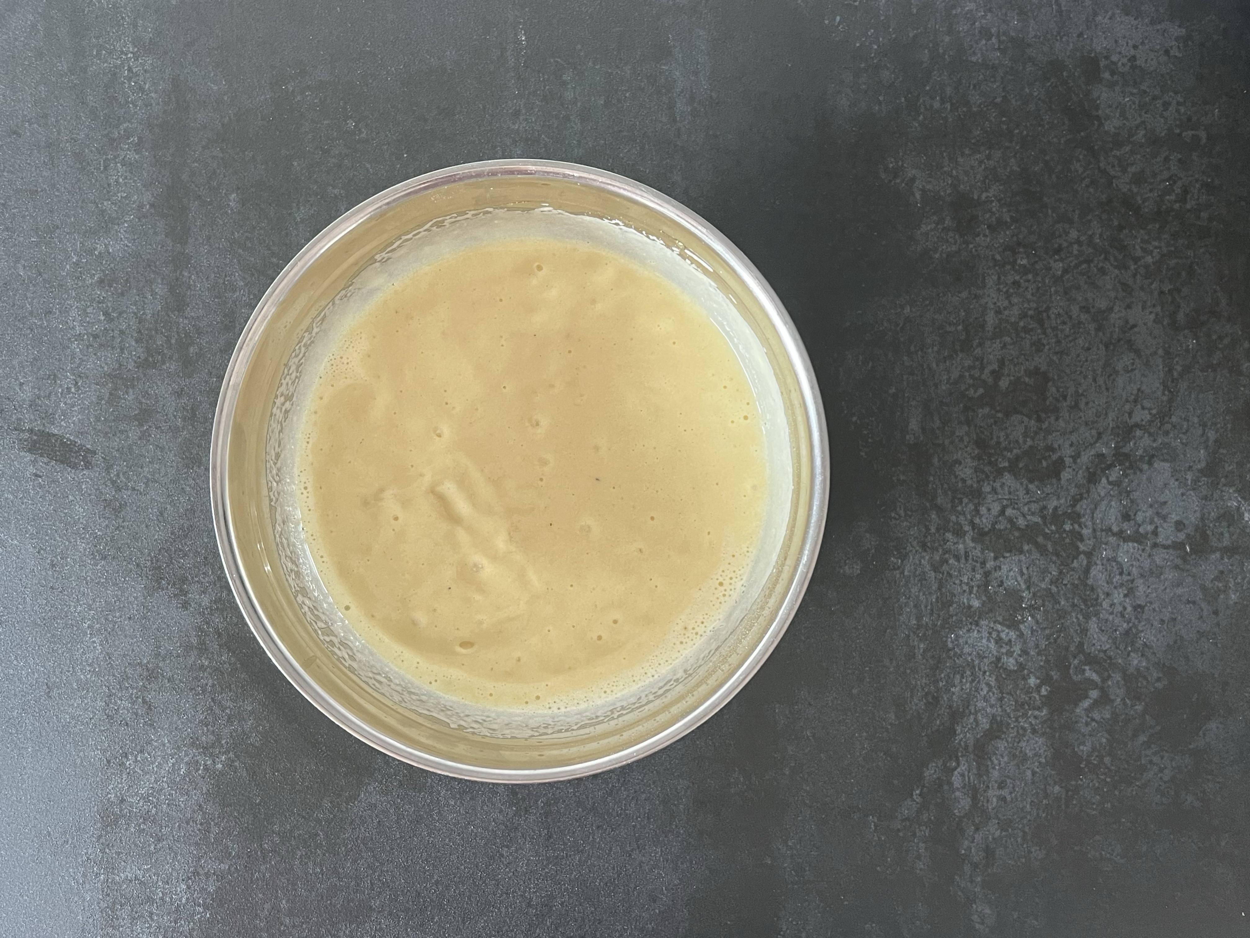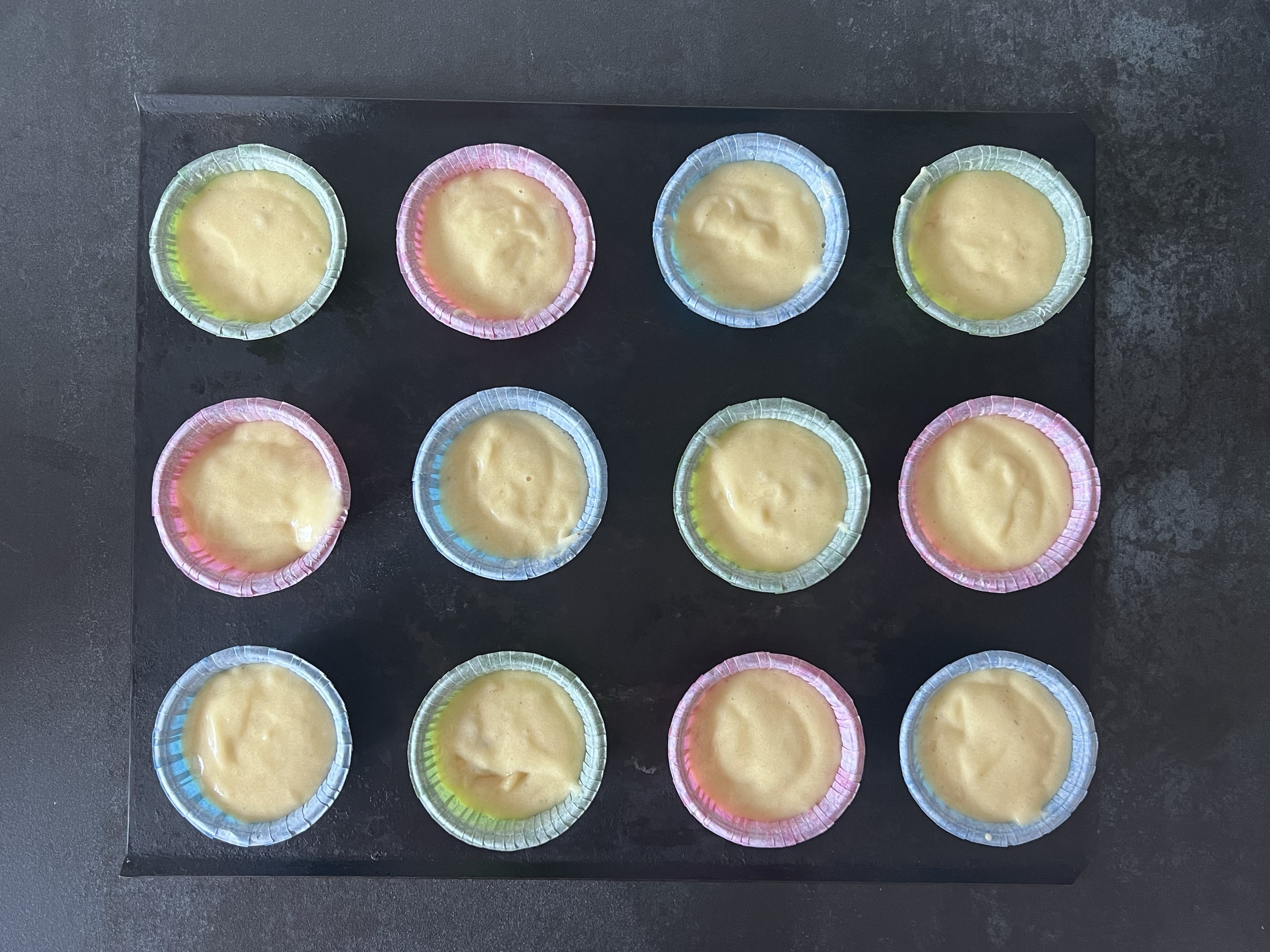 Jag börjar med muffinsen. Blandar alla torra ingredienser till en mix. Smälter smöret och tillsätter mjölken, och sen mosar jag bananen. Efter det vispar jag ägg och socker vitt och pösigt. Tillsätter smörmjölken och vispar samman på låg hastighet. Därefter tillsätter jag mjölmixen och vispar slätt på låg hastighet innan jag gör detsamma med den mosade bananen.