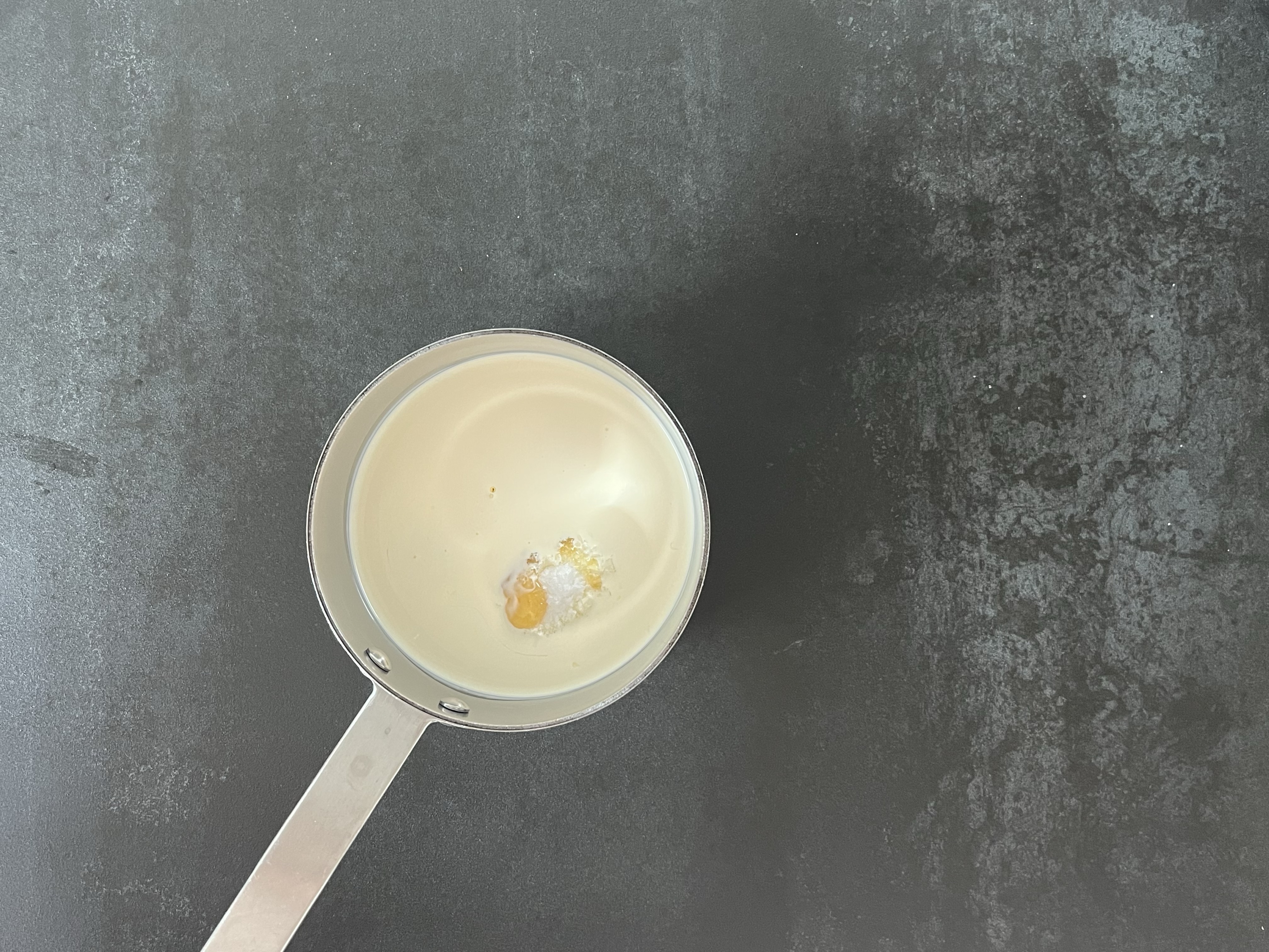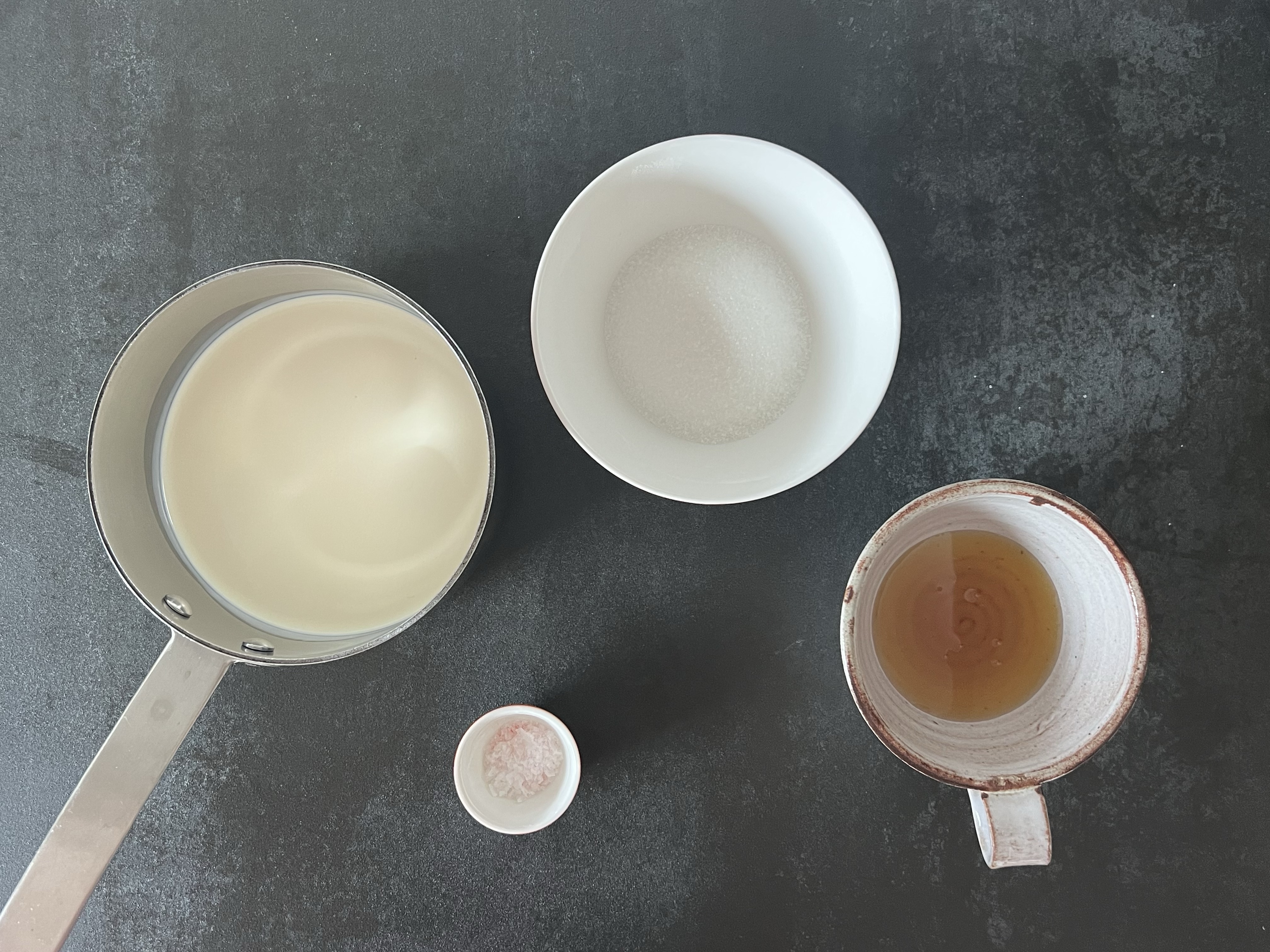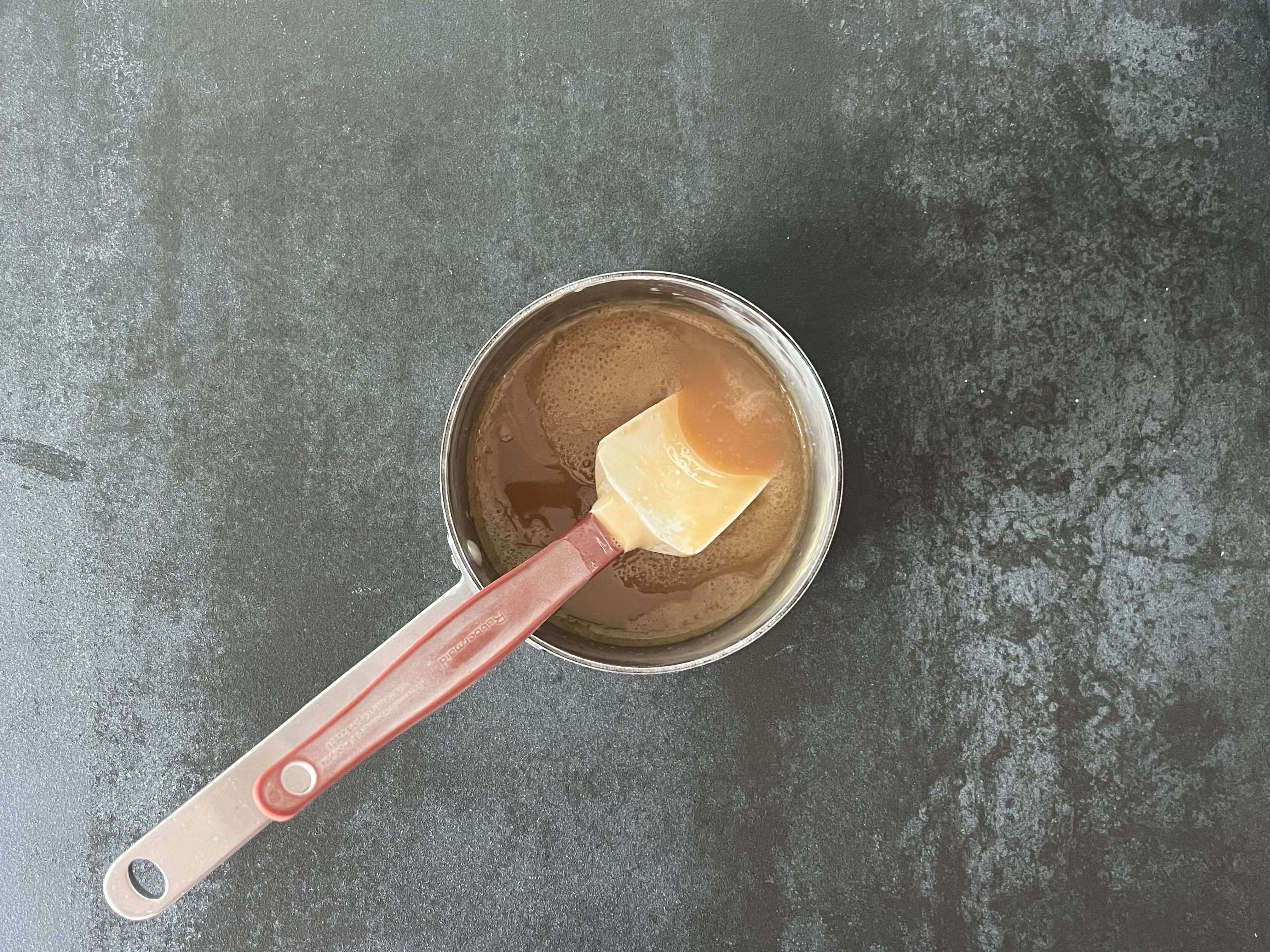 När de står i ugnen börjar jag med kolakrämen. Alla ingredienser placeras i en liten tjockbottnad kastrull och kokas upp under omrörning. Sen sänker jag temperaturen och låter kolan sjuda i ca 20-25min, tills den blir till en tjockare kräm. Då gäller jag den i ett nytt kärl och kyler den, tills den blir ljummen.