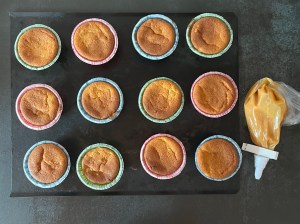 När både muffinsen och krämen svalnat sprutar jag in en rejäl klick i varje muffins, med en spritspåse och smal tyll.