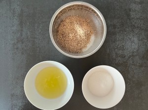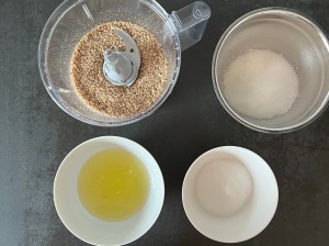 Jag börjar med att väga upp alla ingredienser till nötmarängen. Sen mixar jag hasselnötter till ett fint mjöl med små bitar i, sen blandar jag nötmjölet med majstärkelse och strösocker och ställer åt sidan.