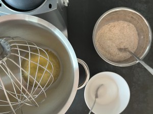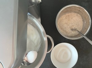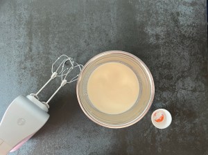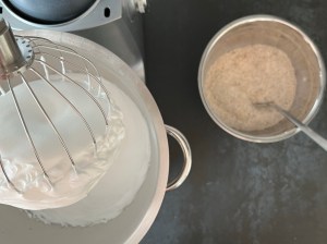 Efter det vispar jag äggvitorna till ett fast skum, för att därefter tillsätta strösocker, en matsked i taget samtidigt som jag vispar på full fart. Vispar tills det är en fast maräng.